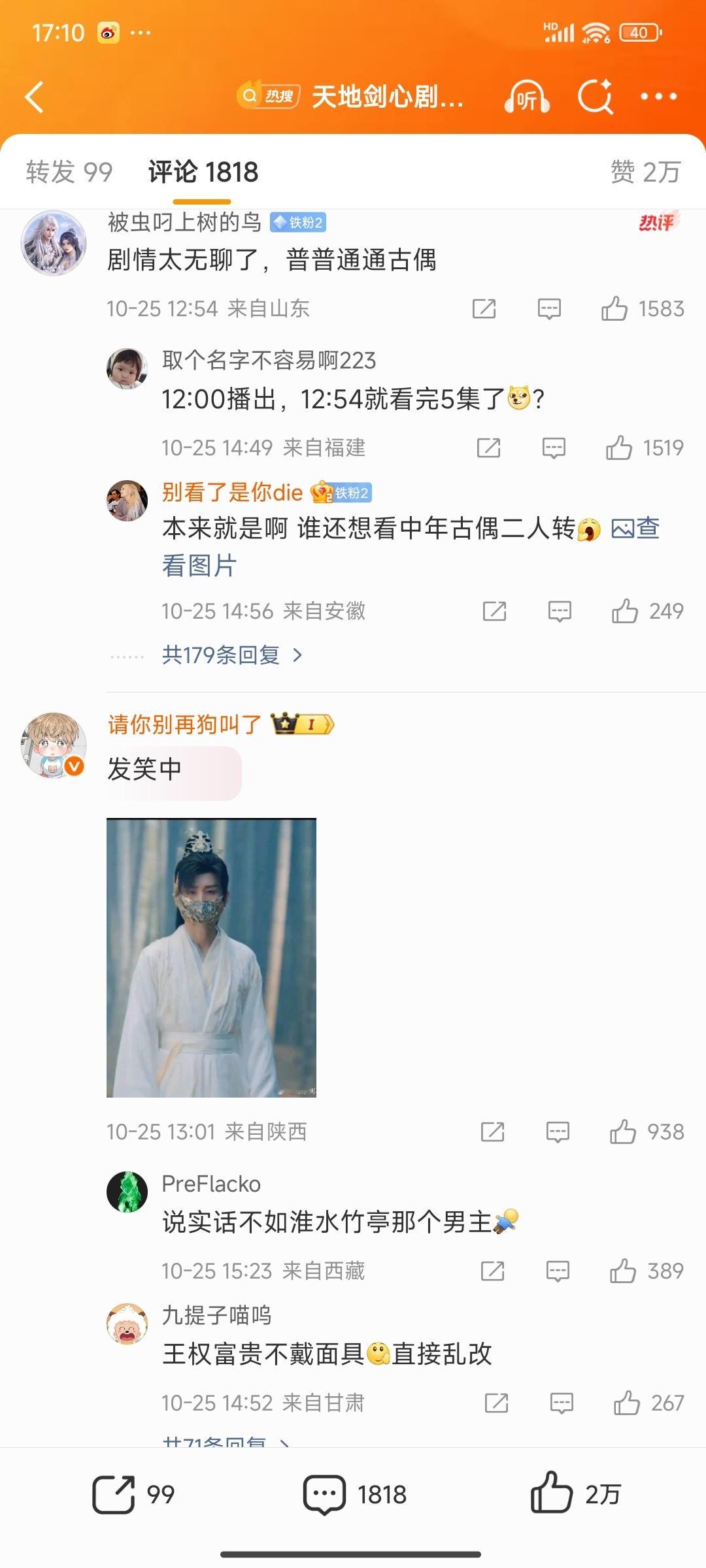 天地剑心剧情毫无波澜观众吐槽剧情太无聊了,普普通通古偶!集均在1700左右,剧情立不住的话,那这剧上线真的就不大了!无论什么剧~剧情才是王道!这没错啊