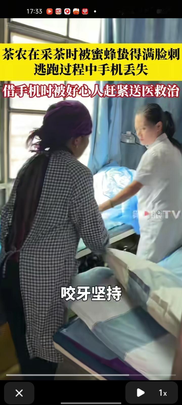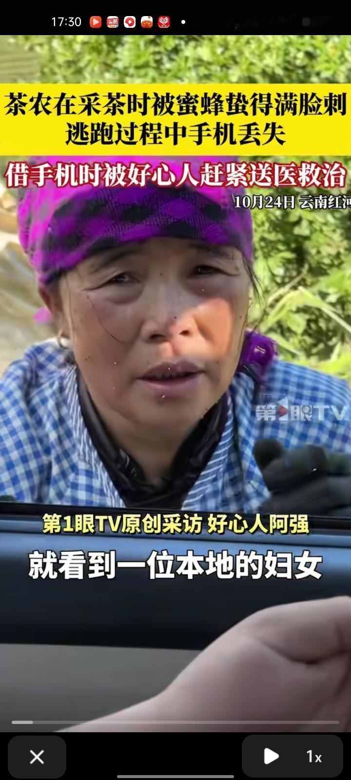 10月24日,红河州绿春县。司机开车的路上遇到一位阿姨求助,阿姨采茶时被蜜蜂蛰的满脸刺,逃跑过程中手机也丢了,阿姨跑到公路上就借手机打电话。打完电话后,司机让阿姨上车送往最近的卫生室治疗,经治疗阿姨无大碍。 司机表示,看到她的脸我们很心疼,只想赶紧把她送医,好缓解她的痛苦。