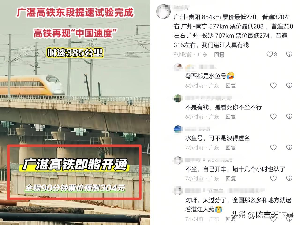 本以为湛江水鱼号已经够贵了,没想到新开通的广湛高铁更贵! 原先的水鱼号虽然要坐150多分钟,但260的价格,咬咬牙关还能接受。 以为新增一条新高铁就是为了改善水鱼号时速慢的问题,但没想到价格也跟着改善。 说真的,385公里耗时90分钟要304元的票价,不是过年过节,也都不会有几个人坐吧! 我是宁愿坐大巴,甚至是自己开车堵10个小时都坐不起,平常不堵车也就5个多小时,私人大巴票价才39.9,都能来回坐好几趟了。