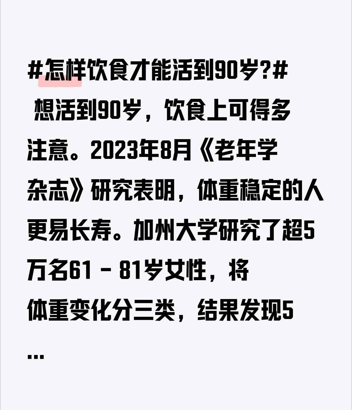 怎样饮食才能活到90岁? 想活到90岁,饮食上可得多注意。2023年8月《老年学杂志》研究表明,体重稳定的人更易长寿。加州大学研究了超5万名61 - 81岁女性,将体重变化分三类,结果发现56%的女性活到90岁,体重稳定的女性长寿可能性是体重减轻5%以上者的1.2 - 2倍。 要想体重稳定,饮食得均衡,像高油高盐高糖的饭就得少吃。比如炸鸡、蛋糕、咸菜这类,偶尔吃还行,顿顿吃可不行。多吃蔬菜水果、全谷物,每餐七八分饱,这样才能给长寿加分。