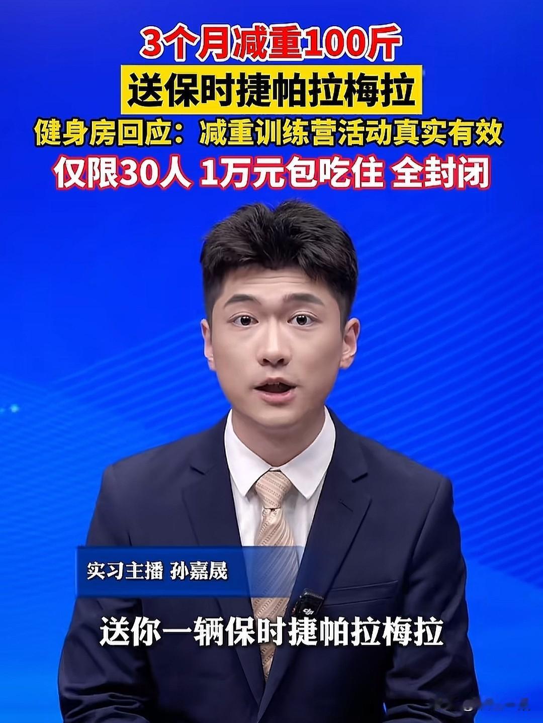 三个月减重一百斤,送你一辆保时捷帕拉梅拉,山东滨州一家健身训练营,推出了一项减重挑战赛,承诺只要在三个月内成功减掉一百斤以上,就能获得一辆保时捷帕拉梅拉,赢了之后直接过户。 双人间包吃包住全封闭式训练满三十人报名,截止目前已有七八人报名,关于这辆诱人的保时捷教练表示,这辆车是老板的,是一辆2020款的帕拉梅拉,并非新车,原价超过一百万,已经开了几年了。 有意愿减肥的可以去看一下,1万块差不多也就是减肥训练营3个月的费用。 那人至少得要200多斤,不自律管不住嘴,减肥起来相对比较困难,但重金之下必有勇夫,没有十足的信心,就不要去浪费那1万块钱的报名费了。