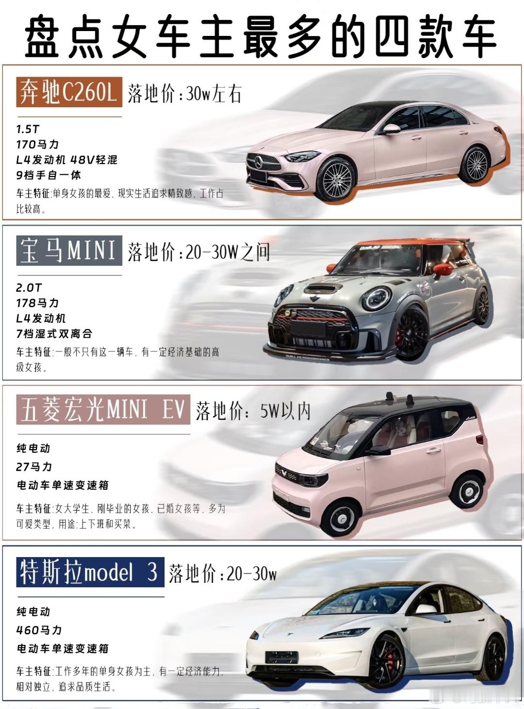 据说这是女车主最多四款车型,刚好2油2电,都特别能体现出车主的风格,同样是30W的预算,选C260的和COOPER的真的完全不是一种人[允悲]……不过毛豆3男车主也真不少[挖鼻]