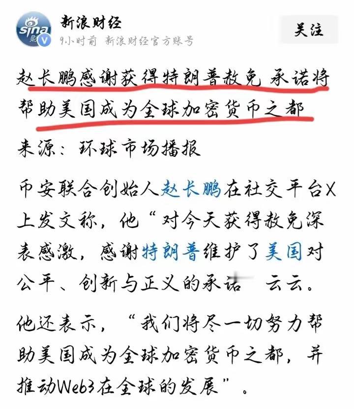 [吃瓜群众]川普为何会“特赦”币安赵长鹏?赵长鹏也很“上道”,那是“表忠心”[思考]莫非是——“金融诈骗”行业“惺惺相惜”?想多了,他大概是要给华尔街和硅谷那帮财阀“打个样”——只要肯“合作”,就“只图财不害命”[灵光一闪](潜台词:要是“不合作”,就不好说了[大金牙])