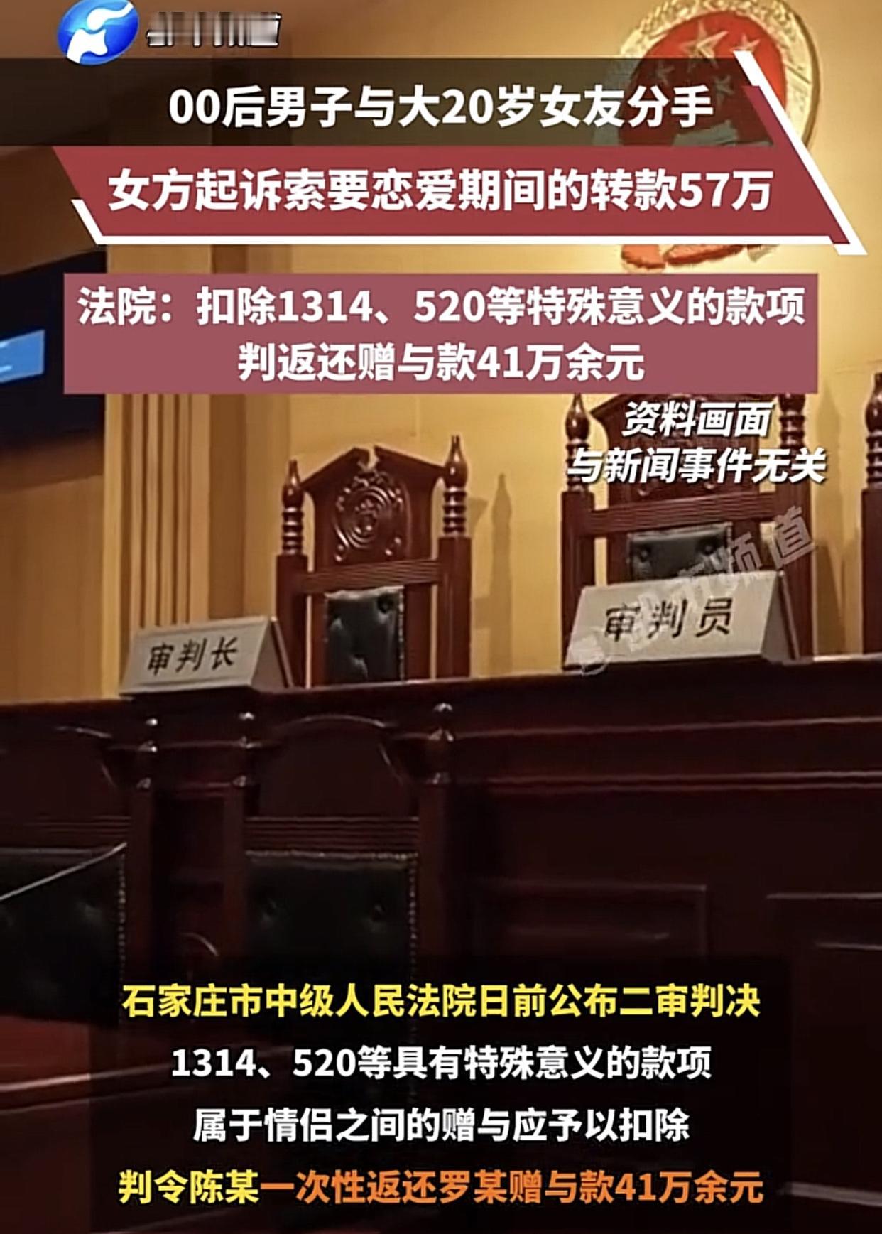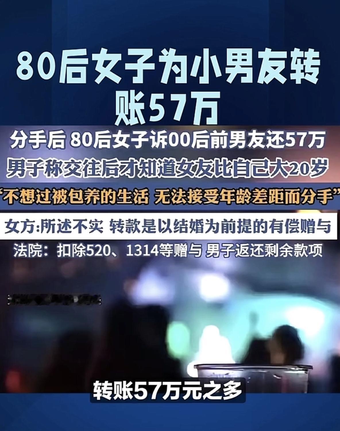 “不想被包养!”男子被判退回女方41万! 00后男子在酒吧工作,认识了一位80后女子,没多久俩人就共处一室过去了“夫妻”生活。三年后,男子发现女子比自己大20多岁,认为被对方骗了,提出分手。 三年间男子总共花了女子57万,女子要求男子归还全部金额,否则别想离开。而男子认为57万是自己三年付出的代价,坚决不还,女子一怒之下将男子告了。 法院经过调查后,判定男子除了女子在三年里男子生日,还有特定节日转给的1314以及520这些零钱外,要一次性退还女子共41万。 (来源:都市频道) 一个比自己大20多岁,三年了都还看不出,说出来都没人信,没有过上自己想要的那种被包养的惬意生活吧?人家女子要求结婚心又不甘,三年的青春才50多万,所以才提出分手,终究是00后太嫩了点。