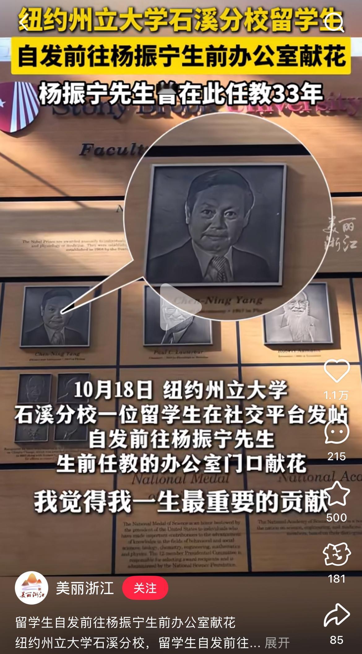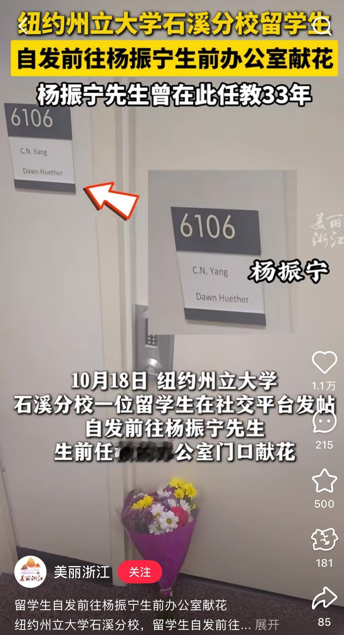 你敢信吗? 杨振宁先生退休26年, 美国石溪大学的6106办公室还一直为他留着,如今门口摆满了悼念的鲜花,这哪是留一间办公室,分明是把对大师的敬重刻进了校园骨血里。 多少中国学子冲着他来这儿读物理,得知他逝世的消息,有留学生半夜爬起来去献花,黑板上写满“RIP”的留言。 但比起这些温暖的细节,更打动人的是他的“双重不朽”。 他的学术成就早已站在牛顿、爱因斯坦的行列,杨-米尔斯理论撑起了现代物理的半壁江山,连诺奖都得跟着他的成果“接龙”颁奖。 更难得的是他从未止步,80多岁还在清华给大一新生上课,一辈子都在为中外科技搭桥铺路。 真正的大师从不是活在头衔里,而是活在他开辟的领域里,活在后人的追慕与传承里。 你觉得这份跨越国界的敬重,最核心的来源是什么?评论区聊聊~杨振宁 杨振宁