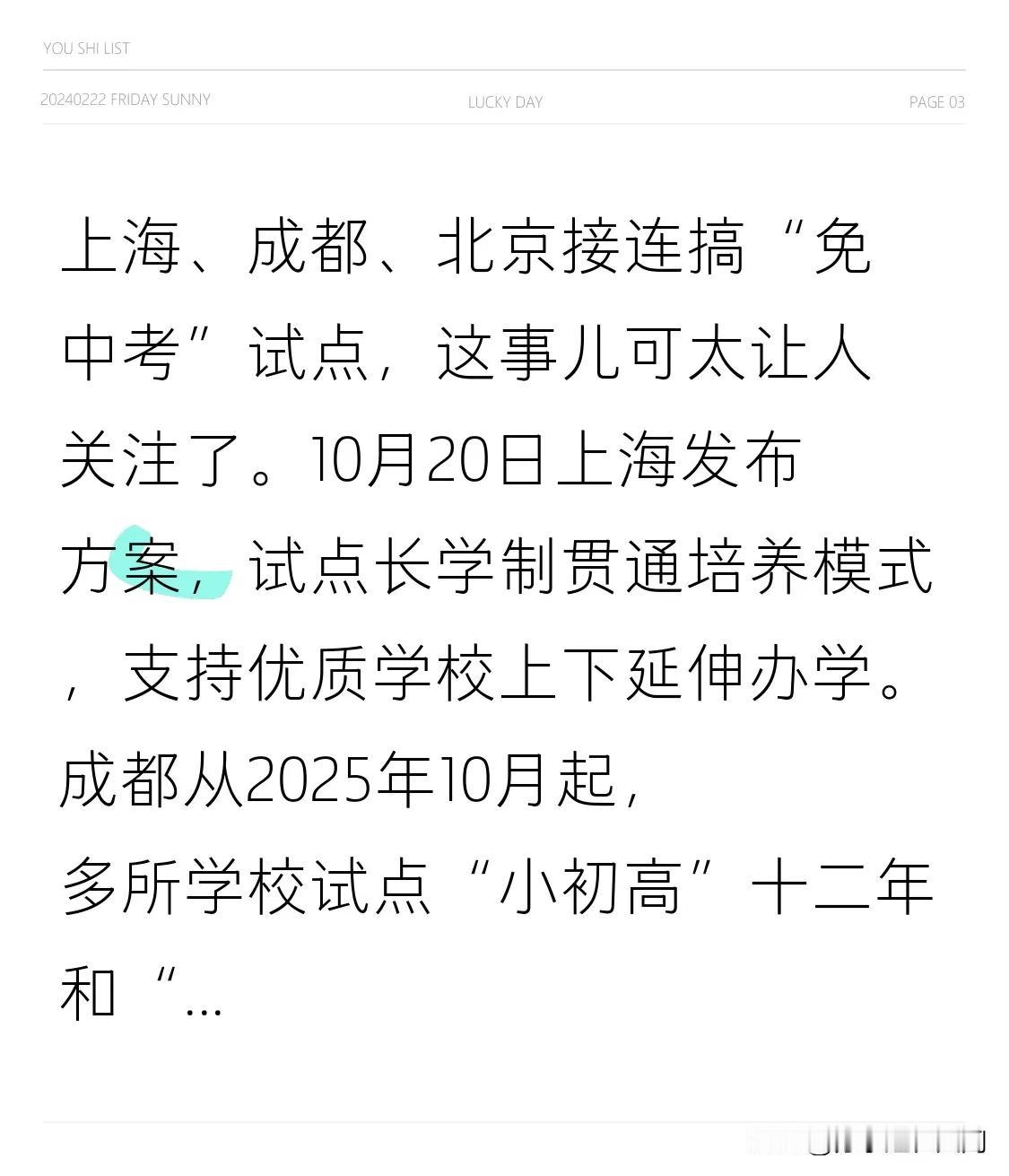 上海、成都、北京接连搞“免中考”试点,这事儿可太让人关注了。10月20日上海发布