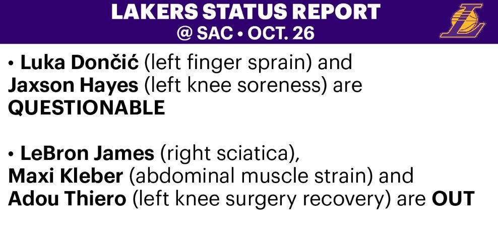 明天客场对阵国王,东契奇(左手手指扭伤)海斯(左膝酸痛)出战成疑。​​​