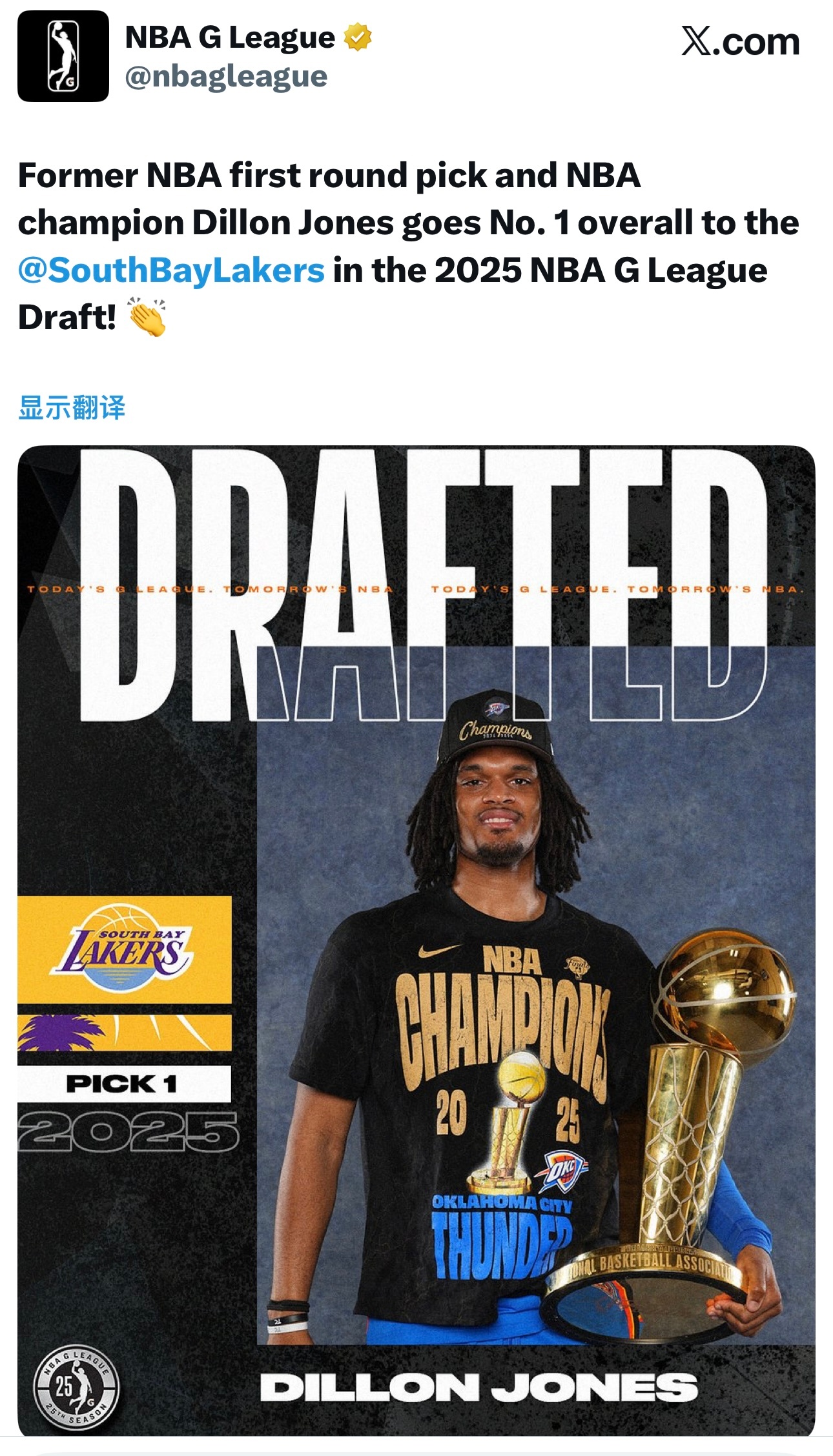 发展联盟选秀,南湾湖人用状元签摘得今年夏天在雷霆得到总冠军的后卫狄龙·琼斯。