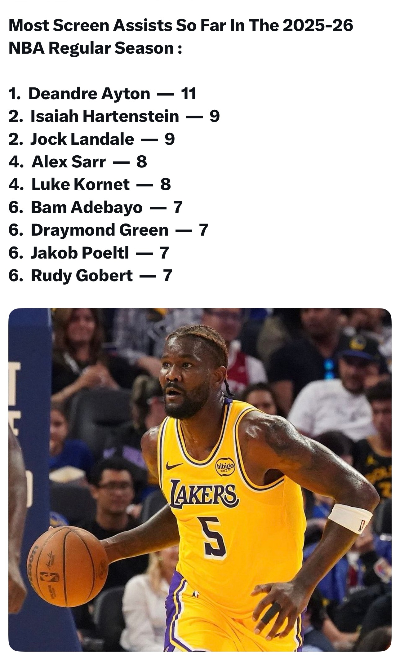 据美媒统计,常规赛截至目前通过挡拆帮助队友得分的榜单: