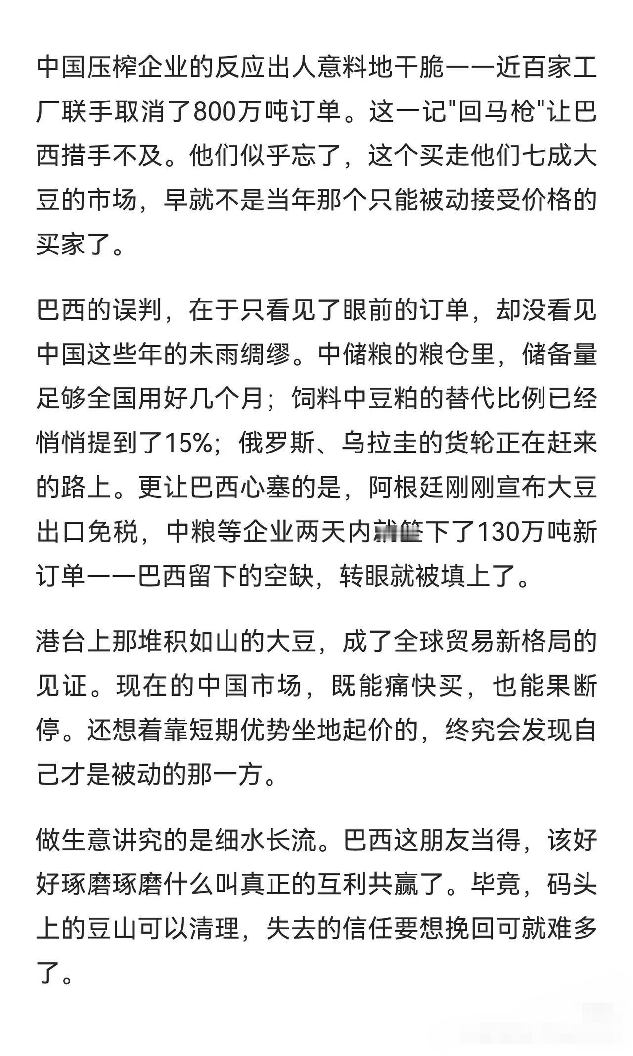 据去非有限的了解,巴西的农业中大豆的供应链外资企业控制占了76.1%,控制着巴西大豆出口贸易的70-80%。说白了,就是巴西自己没有主动权。