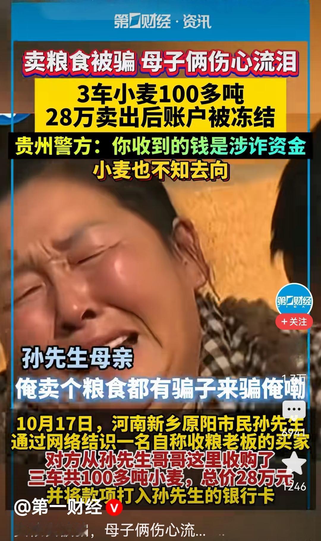 心疼河南新乡这对卖粮母子。辛苦种出100吨小麦,好不容易谈好买家,收到28万粮款,结果钱被银行冻结,警方说是涉诈资金。原来是收粮老板利用他们账户洗钱。 这母子俩真是倒霉透顶,正常卖粮却卷入这种破事。他们哪能想到这笔钱有问题,以为交易顺利完成,结果生活全乱套。生意没法做,一家老小生活成难题。现在骗子手段太高明,农民根本防不住。银行冻结账户,也没考虑普通人的难处。希望警方赶紧破案,让这家人恢复正常生活,别让老实巴交的农民再遭罪了。