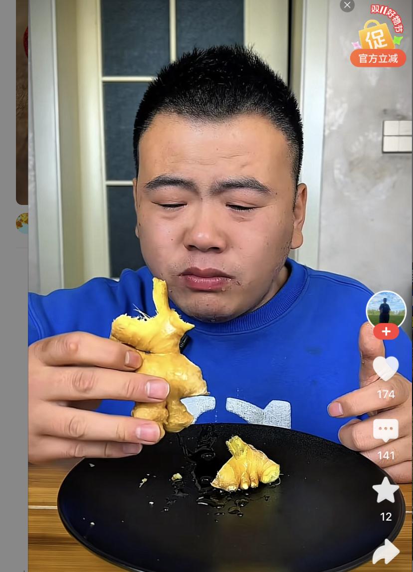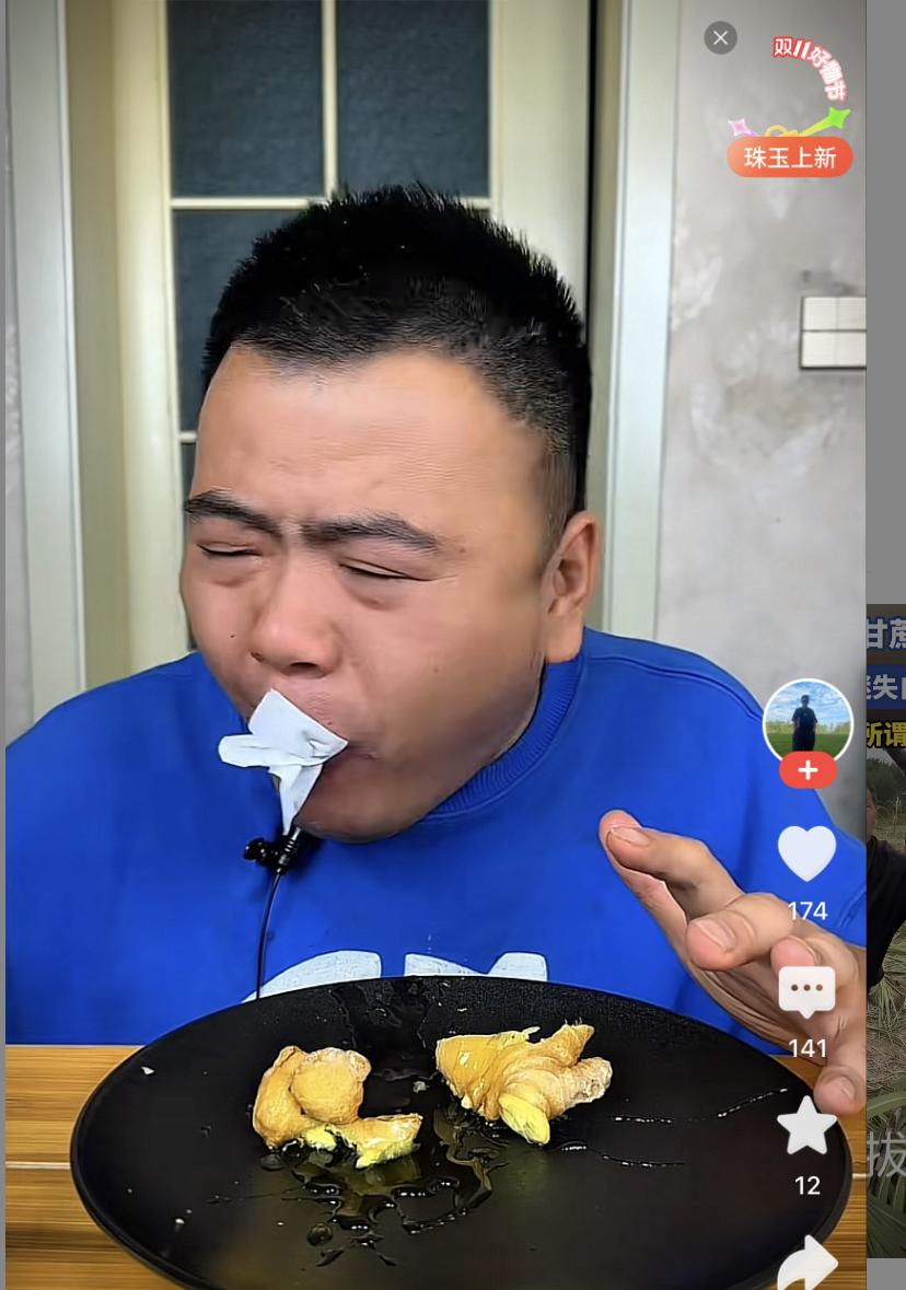 各位看官唉!千万别离开,吃着生姜的我眼泪都要掉下来! 吃播博主琪哥,前段时间不知什么原因,吃东西时,总是剧烈摆头,甚至连面都糊脸上了! 后来,慢慢不摆头了! 今天刷到视频,居然在吃蜂蜜粘生姜,后来辣得眼泪就要掉下来了! 生姜性辣,一般老姜作为去腥除味提鲜,都是不直接吃的。子姜脆嫩,辣味淡,泡成泡菜酸辣爽口,切成小片烧鸭,味道鲜美,可以少少吃点,切成丝丝炒肉丝,也很下饭。 这样直接吃老姜,简直难以下咽。不好吃不美味!可能真的比卫生纸更难吃! 哎!