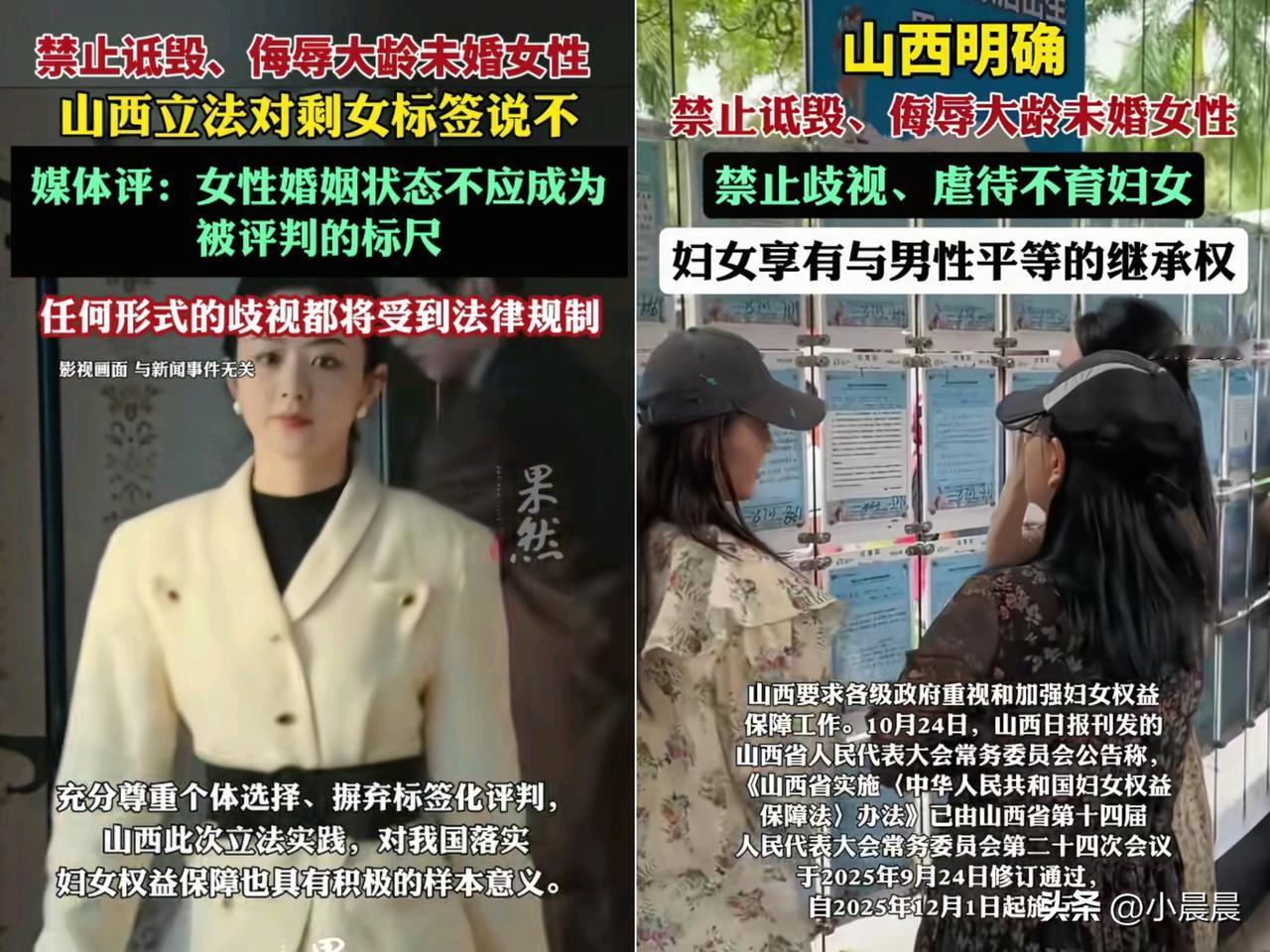 开始反击了! 当“剩女”标签还在给大龄未婚女性 泼脏水时,山西直接立法说“不”了! 10月24日,山西把“禁止诋毁、侮辱大龄未婚女性”写进地方法规,这波操作太硬气。 长期以来,大龄未婚女性被“剩女”标签绑架,职场晋升受阻、家庭催婚压力山大,这种歧视就该被法律摁住。 山西立法传递的信号很明确:女性结不结婚,轮不到别人指手画脚,任何歧视都别想逃过法律制裁。 但这绝不是终点,保护女性权益得全方位发力。 那些给女性贴的各种恶意标签,不管来自内部还是外部,都该被法律好好管管。 你觉得还有哪些对女性的标签化羞辱该被立法禁止? 来聊聊你的看法~