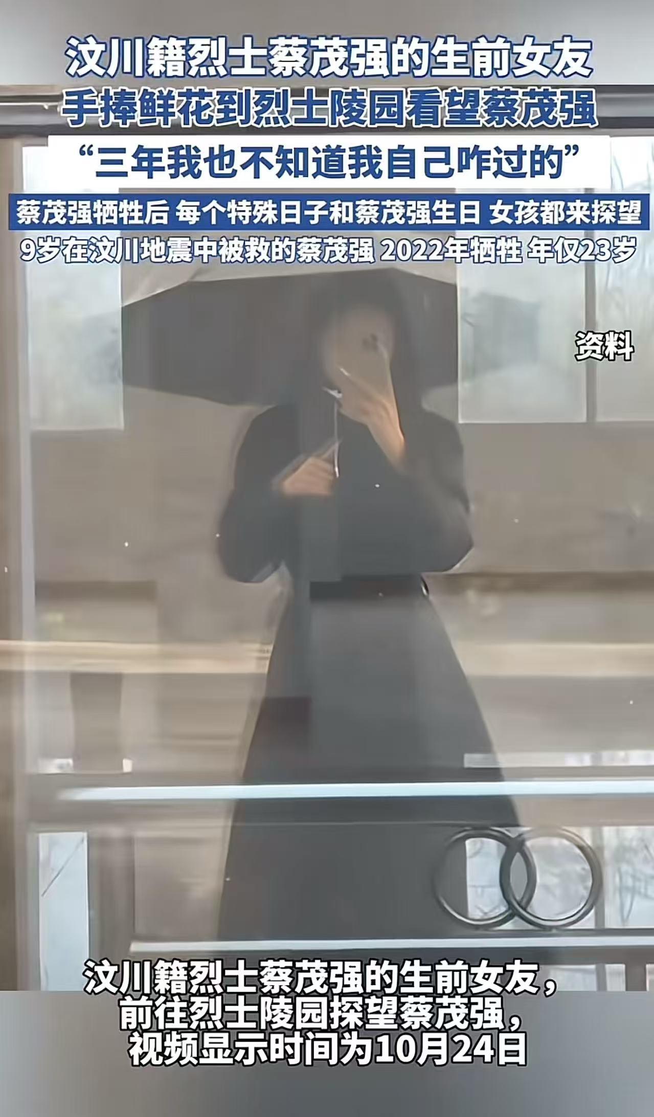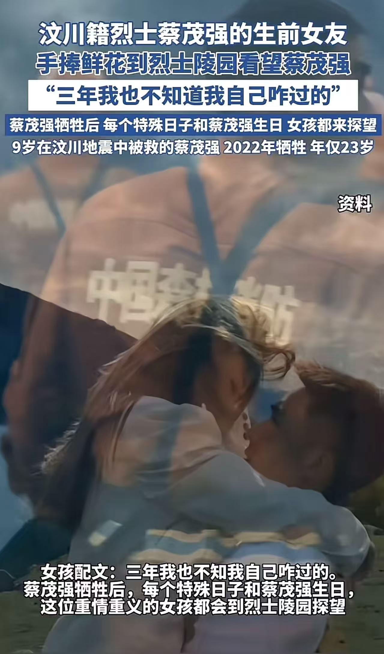 看哭了!汶川籍烈士蔡茂强23岁牺牲,生前女友手捧鲜花到烈土陵园看望他!女友:“三年了,我也不知道我自己咋过的……”网友:真是个好姑娘,三年了,可以放下了,好好过自己的人生吧! 蔡茂强是四川省汶川县的一名消防员,出生于1999年12月。 2008年,那场突如其来的汶川地震,如同一头狰狞的恶魔,瞬间将无数家庭的美好撕得粉碎。 年幼的蔡茂强和家人被无情地掩埋在废墟之下,在黑暗与绝望中,是英勇无畏的武警战士们,用他们坚实的臂膀和温暖的双手,将蔡茂强一家从死神的手中夺了回来。 这份被救的恩情,在蔡茂强幼小的心灵中种下了守护与奉献的种子,从此生根发芽。 时光飞逝,2019年12月,怀揣着对消防事业的无限热爱和对守护人民的坚定信念,蔡茂强毅然决然地加入了消防救援队伍,成为了一名光荣的消防员。 从那一刻起,他便将自己的青春与热血,毫无保留地奉献给了这片他深爱的土地。 入职后,蔡茂强迅速成长为一名业务精湛、作风过硬的消防战士。他先后参加了14次森林草原灭火任务和6次综合救援任务,每一次面对危险,他都毫不犹豫地冲在最前面! 然而,命运却总是如此残酷。2022年10月17日,湖南省永州市新田县突发森林火灾,火势凶猛,情况万分危急。蔡茂强随队千里机动、跨区增援,义无反顾地赶赴一线灭火。 10月21日9时42分左右,火场局部突发爆燃,为了掩护地方扑火队员和战友安全撤离,蔡茂强毫不犹豫地留在了最后。 他用自己的身躯挡住了肆虐的火舌,为战友们争取了宝贵的撤离时间。 可是,他自己却被严重烧伤,尽管医护人员全力抢救,但他最终还是不幸壮烈牺牲,年仅23岁。 当时的他,距离自己23岁的生日仅有两个月,他的人生才刚刚绽放出绚烂的光彩。 他有一个心爱的女友,俩人一起看新房,憧憬着组建一个幸福美满的家庭,生儿育女,共度一生。 但这一切美好的憧憬,都被无情的大火瞬间吞噬,只留下无尽的遗憾和伤痛。 对于蔡茂强的女友而言,这无疑是晴天霹雳,将她原本幸福美满的生活瞬间击得粉碎。 曾经,他们一起憧憬着未来的生活,计划着婚礼的细节,幻想着婚后温馨的小日子,可如今,这些美好的画面都成了永远无法实现的梦。 她无法相信,那个曾经与她海誓山盟、许下一生承诺的人,就这样永远地离开了她。 每一个寂静的夜晚,她都会在泪水中入睡,梦中又与蔡茂强相聚,可醒来后,却只有无尽的孤独和悲伤。 在蔡茂强牺牲后的每一个特殊日子,这位重情重义的女友都会来到陵园探望他。 她每次都会带布,把墓碑擦得干干净净,仿佛这样就能让蔡茂强感受到她的爱和思念。 她会坐在墓碑前,轻轻地跟蔡茂强讲讲自己的近况,告诉他自己过得很好,只是很想他。 如果蔡茂强没有牺牲,他们可能已经携手走进了婚姻的殿堂,组建了一个温馨幸福的家庭,有了可爱的孩子,一家人其乐融融地生活在一起。 可惜,人生没有如果,命运的无情让这份美好的憧憬永远成为了泡影! 此事引发了热议,有网友说,这个国家,正是因为有蔡茂强这样一批批的英雄,再替我们负重前行,才得以有了今日的岁月静好,致敬英雄!女孩保重! 也有网友说,三年忘不了,三十年也仍然会记起。心里的那个人不在了,谁都是将就。那是真正的白月光,谁都跨越不过去的存在。 还有网友说,三年风雨赴陵园,一束鲜花一声念。英雄未负家国,爱意不负岁月。 蔡茂强,这位年轻的英雄,用自己短暂而辉煌的一生,诠释了什么是责任、什么是担当、什么是无私奉献。他就像一颗璀璨的流星,虽然划过夜空的时间短暂,但却留下了无比耀眼的光芒。 而蔡茂强的女友,她本可以沉浸在悲伤中无法自拔,本可以忘记过去重新开始,但她没有。她用行动诠释着对蔡茂强深深的爱,这份爱跨越了生死,超越了时间。她是一个多么深情、多么坚强、多么重情重义的女子啊! 她用自己的方式,延续着与蔡茂强之间的爱,这份爱,将永远被铭记,永远被传颂!