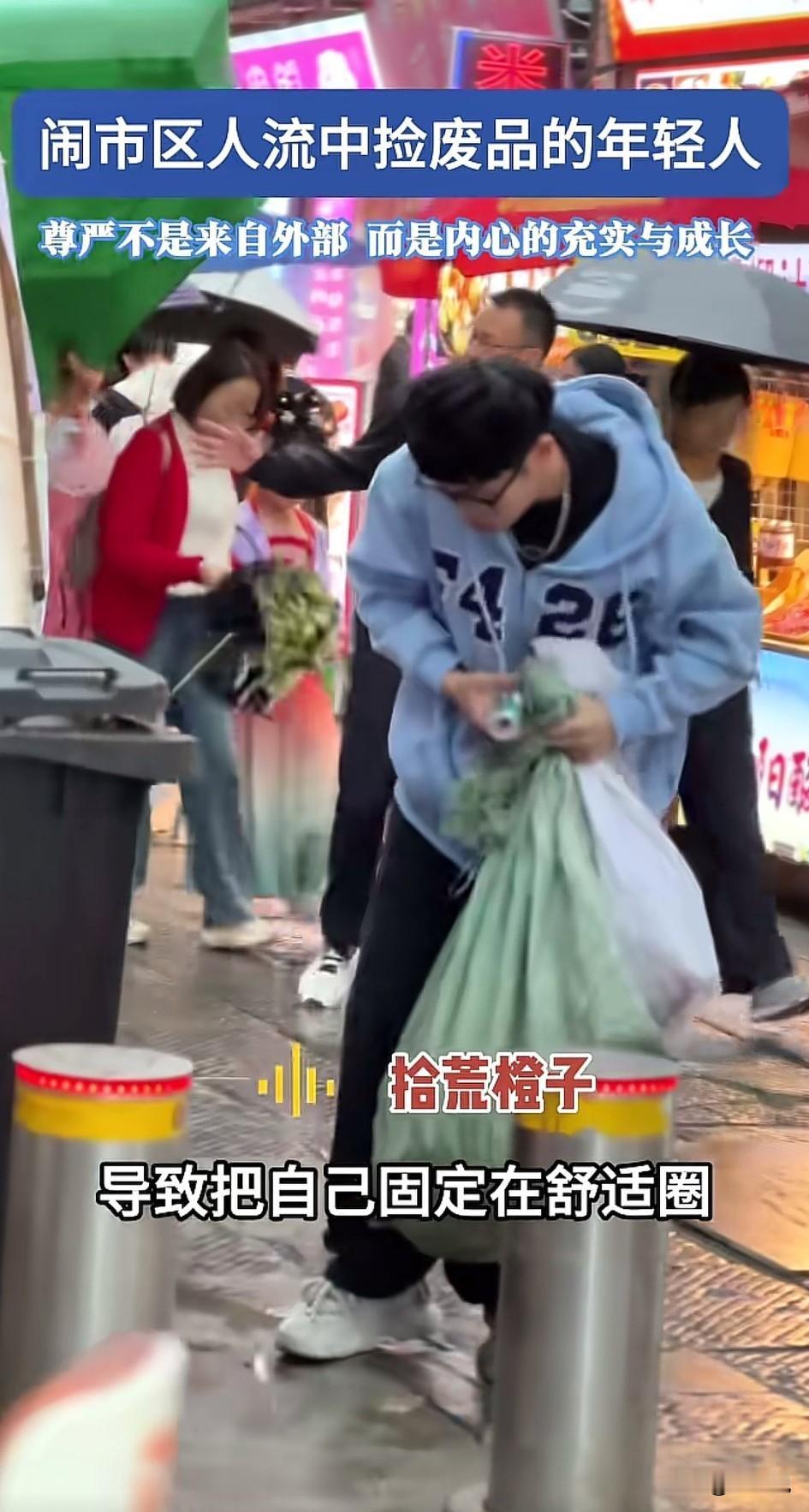 我相信任何正常年轻人,不会把捡垃圾作为主业,说的再鸡汤,也不行。 刷到的鸡汤视频,年轻人在热闹的大街上翻垃圾桶,鸡汤的大概意思是“不要只待在自己的舒适圈,会错过很多成长的机会”。 鸡汤很有道理,但是拍的场景是不是太假。穿的挺好,人也很精神,但是以拾荒者自居是什么意思? 你走出了舒适圈,就是为了捡垃圾? 你如果是体验,或者是锻炼自己,主业是拍视频,那一点问题都没有。相信你也不是一直靠捡垃圾生存的。 不过,你能拍出来,我还是很佩服的。