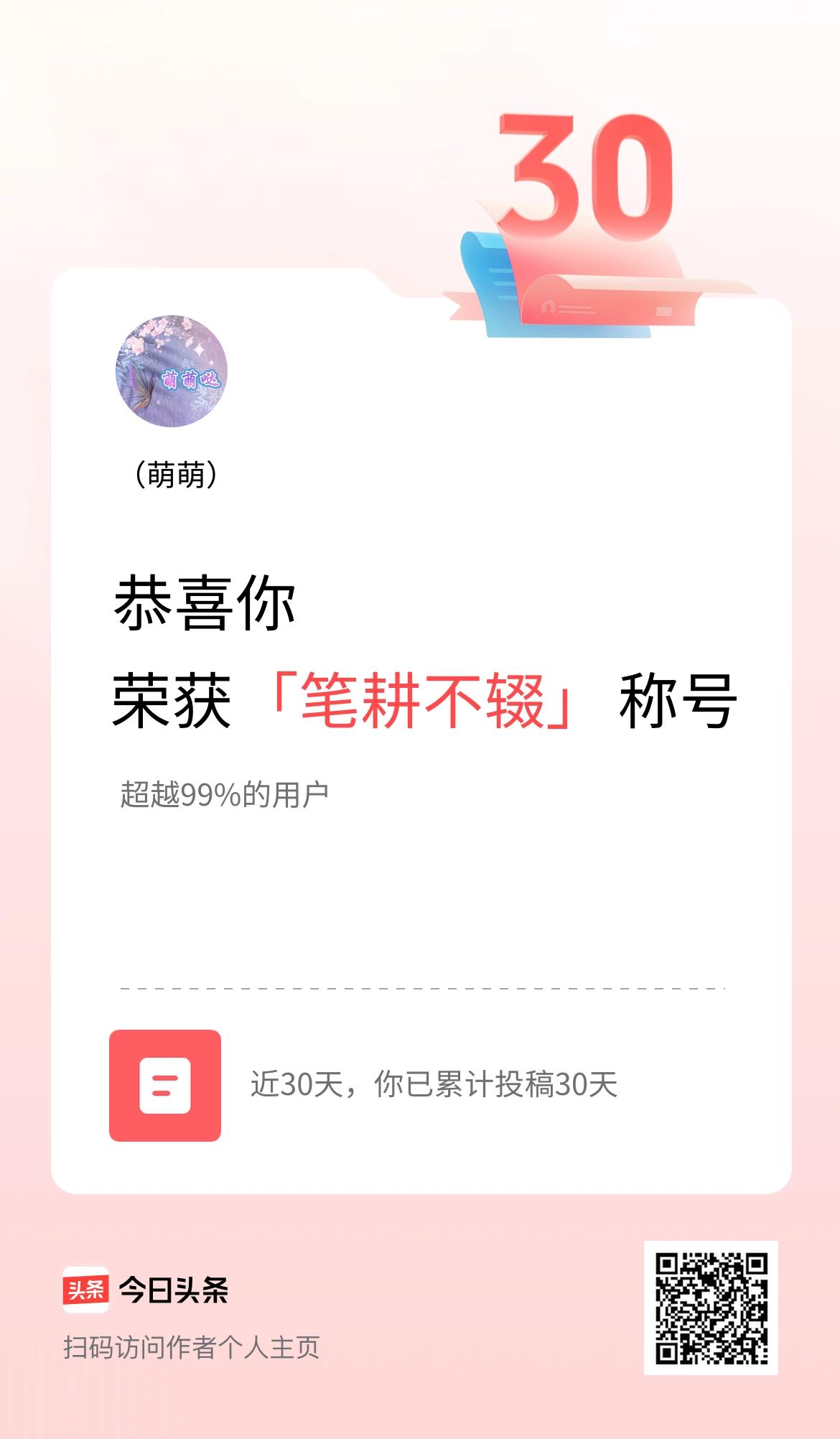 我在头条30天内投稿打卡30天,获得“笔耕不辍”称号