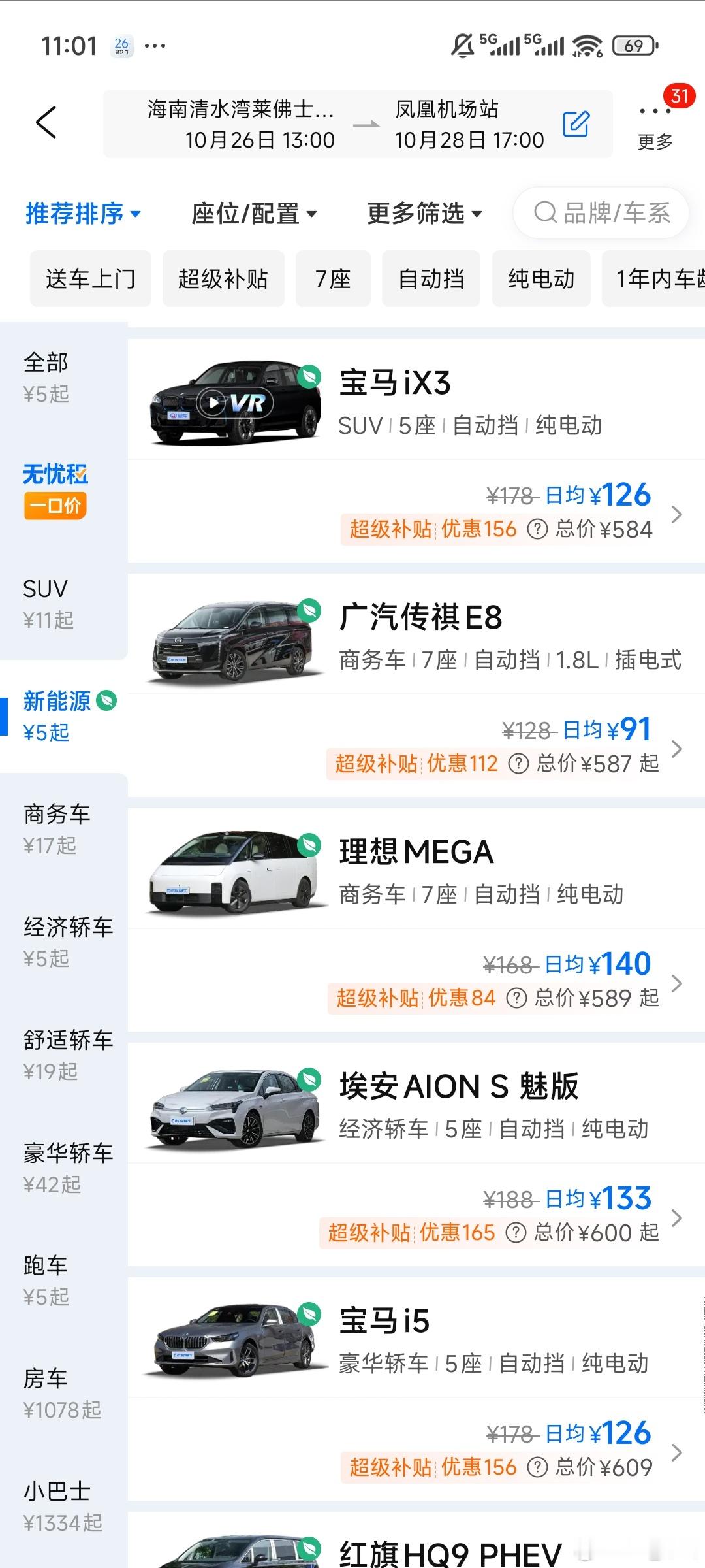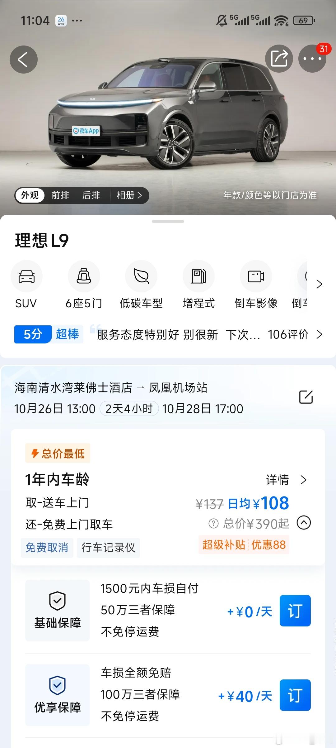 加额外保险费之前MEGA只要不到600/天,理想L9只要不到400/天,如果一家人来海南玩,租个理想还挺好的。