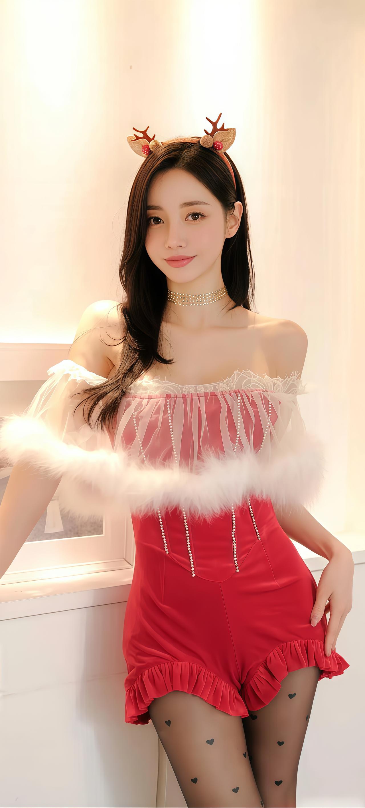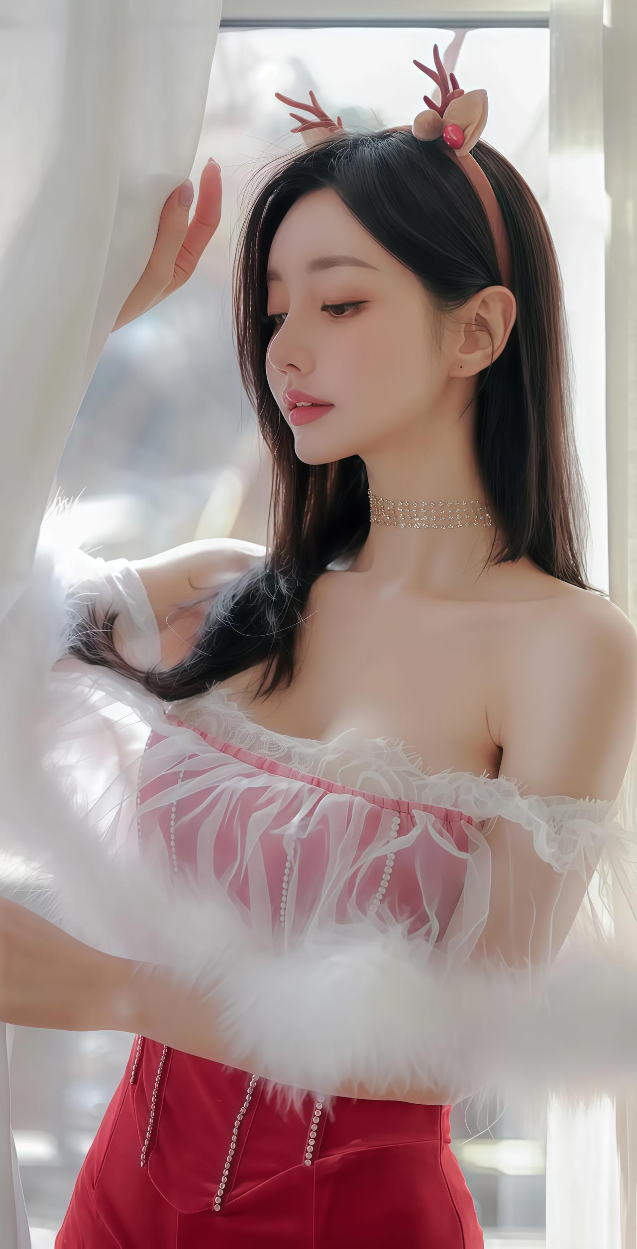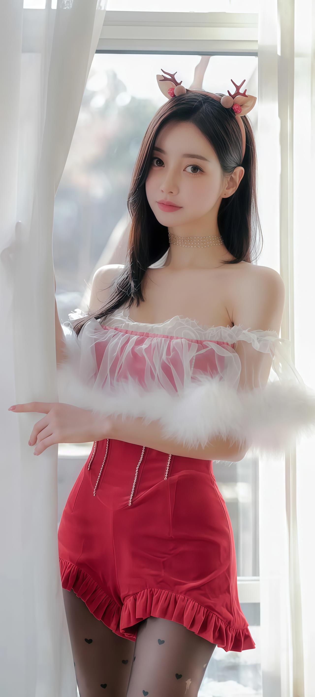 甜美鹿角发饰,红裙少女,优雅气质,拍照必备!