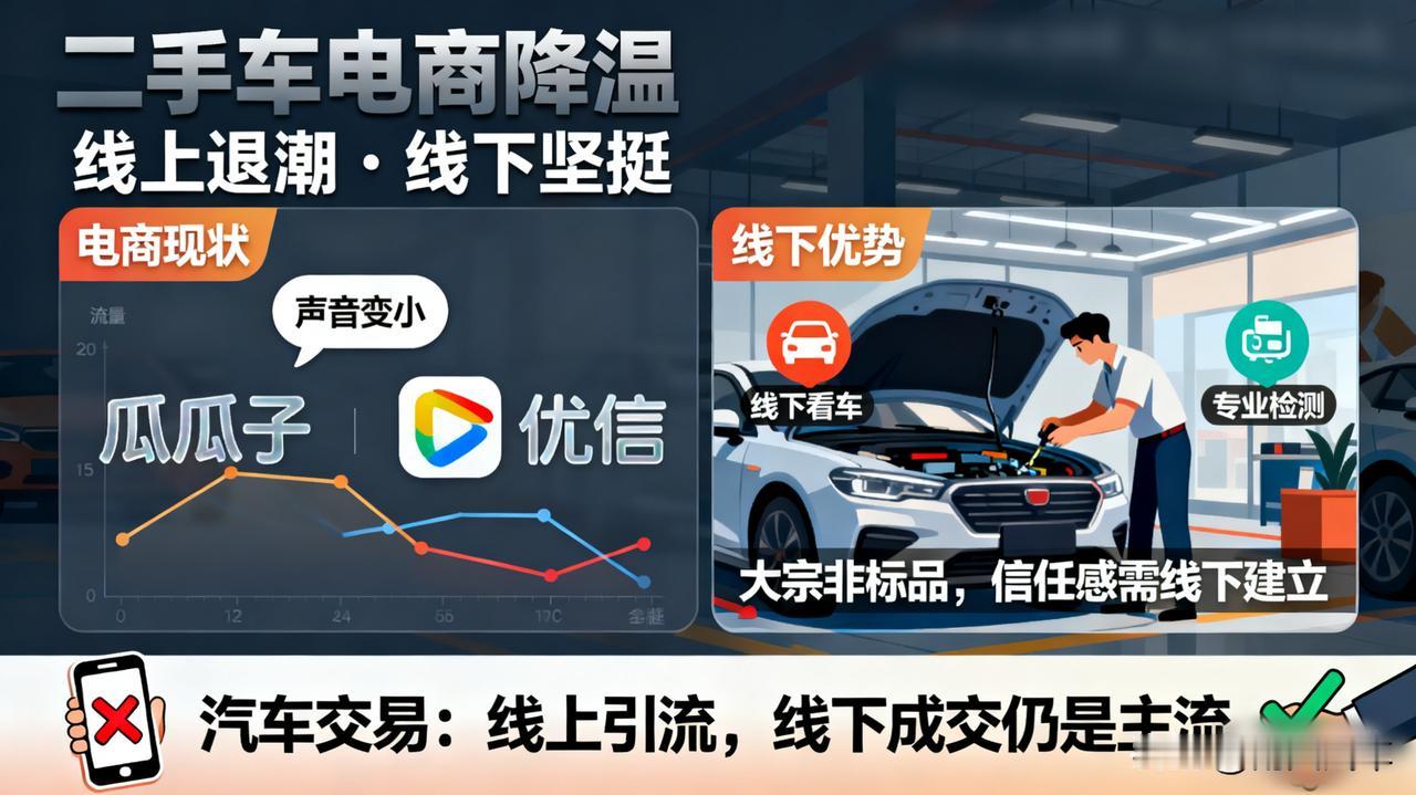 二手车电商降温 瓜子、优信等平台声音变小,线下实体二手车商依然坚挺。 汽车这种大宗非标品,最终还是得线下看车、检测,信任感线上很难建立。 二手车销量 二手车商话术 二手车网站 鹰潭二手车 快手二手车 二手车在线估值 二手车电商