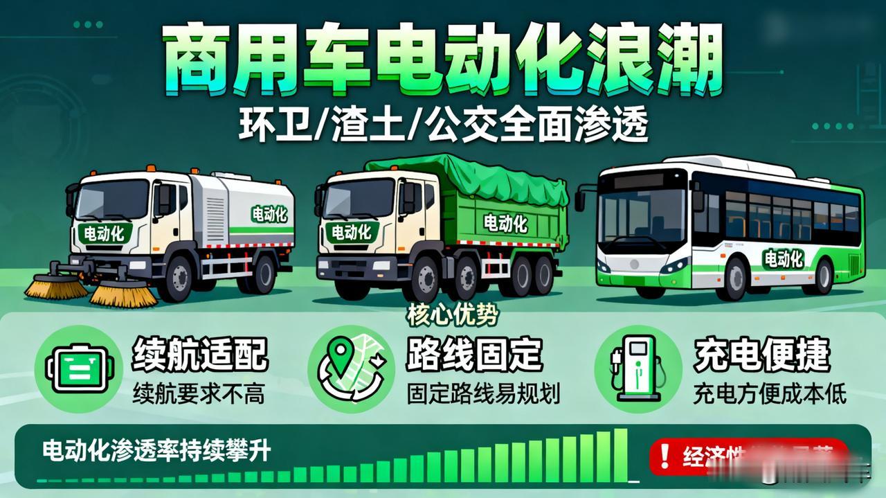 商用车也开始电动化 市政环卫车、渣土车、公交车,电动化渗透率越来越高。 续航要求不高,固定路线,充电方便,电动商用车的经济性优势明显。 汽车行业电动化 纯电动化 商用车新能源化 城市公交电动化 电动车辆 纯电城市物流车 公交纯电化