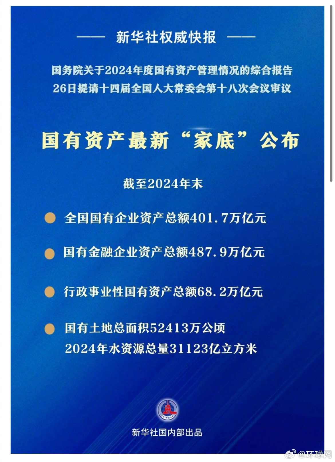 【国有资产最新家底公布】10月26日,国务院关于2024年度国有资产管理情况的综合报告提请十四届全国人大常委会第十八次会议审议,国有资产最新“家底”公布。