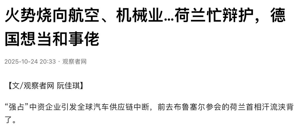 想不到吧?堂堂一国首相,竟然可以如此不顾体面! 荷兰首相斯霍夫在布鲁塞尔峰会的走廊里,向德国总理的抱怨听起来更像是一种无奈的辩解。 这一幕,恰好浓缩了整场风波的核心悖论:一个主权国家,如何在法律上百分百地“拥有”了一家公司,却又在物理世界里对它彻彻底底地“失控”? 这不仅仅是一场商业纷争,它更像一出大戏,揭示了“名义所有权”和“实际控制权”在全球化时代,是如何分裂得如此滑稽。 荷兰政府翻出了一部尘封已久的法律武器——源自1952年冷战时期的《经济紧急权力法》。在他们看来,这足以一击致命。 伴随着9月底的一纸法令,安世半导体的CEO张学政被即刻罢免,公司股份被强制交给托管人。法律层面上,位于奈梅亨的总部被成功接管了。 然而,荷兰人很快发现,他们拿下的,只是一个失去了灵魂的“空壳”总部。真正的反击来自物理世界,迅速且精准。 安世的中国公司直接宣布,荷兰总部的解雇令和停薪威胁统统无效,所有薪酬由中国公司负责。供应链被立刻重组,原材料采购全面转向国内。 更致命的是,安世中国绕开了荷兰总部,不仅直接与全球客户对接订单,甚至果断启用了人民币结算业务。 当全球70%的关键封装产能都牢牢扎根在中国时,那份来自荷兰的法律文件,显得苍白无力。荷兰赢得了一份所有权证书,却输掉了一个鲜活跳动的产业实体。 这颗被强行投下的石头,激起的涟漪迅速演变成席卷全球汽车产业的巨浪。 在德国,宝马在慕尼黑的电动车生产线直接停摆一周,大众引以为傲的狼堡工厂,也不得不痛苦地削减了30%的产能,导致工人们因为轮班休假,每月收入锐减近1200欧元。 恐慌的传导链条无远弗届。日本的汽车制造商协会被直接告知,未来的供应无法保证; 而在中国,一些比亚迪热门车型的提车周期,从45天悄然延长到了90天。美国的汽车创新联盟也发出警告,声称最晚到11月,本土工厂就可能面临停产。 这场危机最终还是狠狠地砸回了荷兰自己身上。本土马斯特里赫特工厂产能陡然下降40%,这一情况引发员工强烈不满。 愤怒的他们走上街头表达愤懑,工会亦随之发出抗议之声,以捍卫员工权益。 闻泰科技启动的25亿欧元国际仲裁,和欧洲车企威胁的每日4000万欧元联合索赔,像两座大山压了过来。与此同时,英飞凌等竞争对手已经毫不客气地吞噬了安世5%的市场份额。 为了掩饰这场决策的灾难,斯霍夫首相抛出了一个听起来很“官方”的理由:“CEO管理不善”。 “管理不善”的公司,能在接管前一个季度营收同比增长8%,订单排到次年三月吗?能在全球功率半导体市场稳居第三,其车规级芯片被每五辆新车中的一辆使用吗? 被罢免时,CEO张学政正在无锡的工厂,和团队讨论如何提升芯片良率。而拼凑起来的真相拼图,则指向了幕后真正的推手:早在6月,美国官员就要求更换CEO;9月中旬,美国商务部长更是亲自到访荷兰施压。 于是,人们看到了斯霍夫在欧盟峰会上狼狈的政治表演:一边向记者高喊“欧洲供应链太脆弱”,暗示责任不在荷兰;一边又私下向德国求援。 最终,10月21日荷兰经济大臣“应约”与中国商务部长会面。这看似寻常的细节,实则蕴含深意,无声却有力地诉说着诸多难以言表之事。 说到底,安世事件是一堂关于全球化时代“权力本质”的公开课。 它冷酷地证明,在今天高度互联的产业链里,任何试图用过时的法律强权去对抗产业逻辑的行为,最终只会将自己困于所设的牢笼。斯霍夫首相急于甩掉的那口“锅”,恐怕会成为压垮荷兰国际商业信誉的沉重负担。