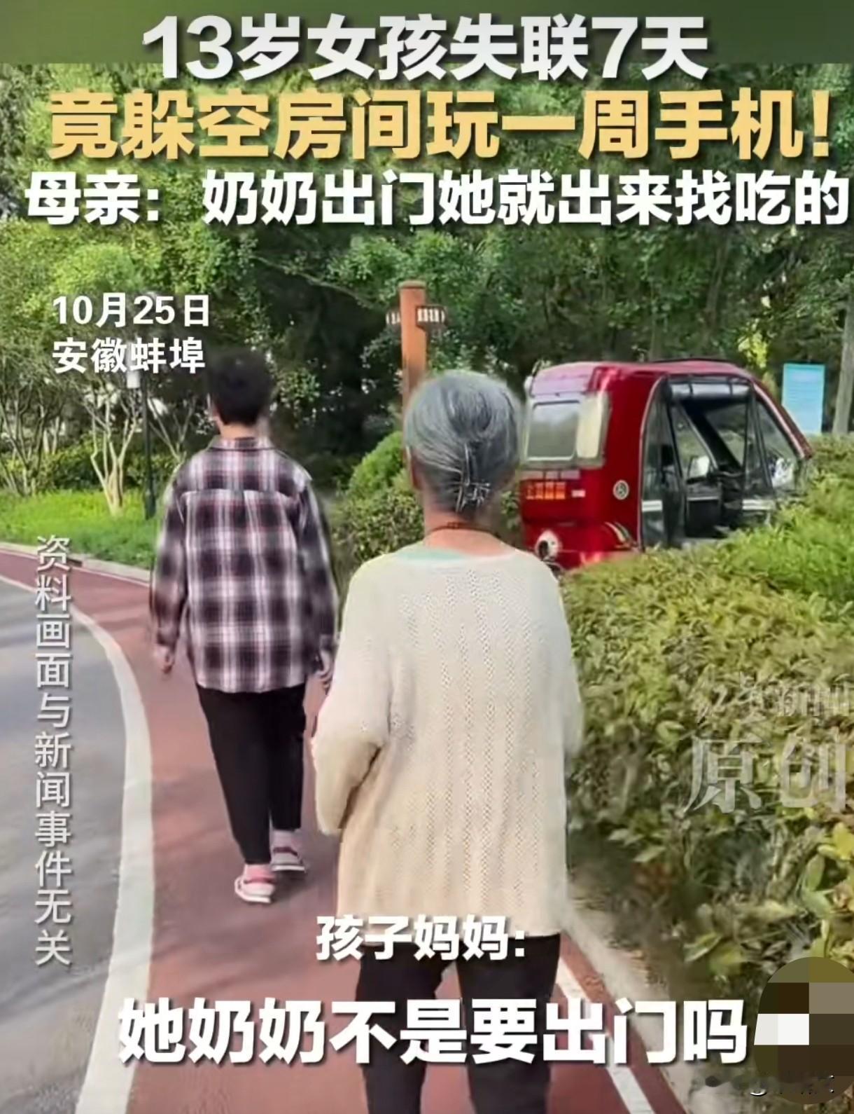 13岁女孩失联一周,全家急疯!结果在奶奶家空房里玩手机? 安徽蚌埠出了件让人又气又后怕的事儿,13岁女孩突然失联,全家找了整整一周,最后发现人竟躲在奶奶家空房里,一门心思玩手机。 这姑娘10月18号没打招呼就离家了,可把家里人急坏了。妈妈杨女士发动亲戚朋友到处找,报警调监控,连附近的河沟、树林都搜遍了,愣是没见着人影。 一周过去,家里人都快崩溃了,谁也没想到,最后在孩子奶奶家的空房间里找到了她。推门一看,姑娘正抱着手机玩得入神,身上又脏又乱,跟前堆着零食袋子。 杨女士后来才弄明白,事儿的根儿在手机上。之前老师反映孩子上课总打瞌睡,一问才知道,姑娘天天半夜躲被窝里玩手机,熬到凌晨才睡,她就把手机给没收了。 不让玩手机,孩子直接急了,趁家里不注意就跑了。知道奶奶白天常出门,就躲进奶奶家空房,等奶奶一走就出来找吃的,晚上就窝在屋里刷手机,把全家人都蒙在鼓里。 你说这孩子心多大,就为了玩个手机,让全家担惊受怕一周,万一真出点啥事儿,后悔都来不及。可这事儿还真不是个例,好多孩子为了手机啥招都敢使。 北京有个13岁男孩,暑假里除了吃饭就是抱着手机玩,凌晨四五点才睡,中午才起床,硬生生把自己关成了“宅男”,亲妈怎么说都不管用。 还有个初二学生,为了玩游戏,花一千块买了个成人账号绕开防沉迷系统,天天抱着手机,吃饭都得一只手扒拉饭,另一只手操作屏幕。 更离谱的是,有孩子玩游戏输了当场魔怔,对着自己脸狂扇耳光,妈妈在旁边怎么骂,他都跟没听见似的,眼里就剩手机屏幕了。 为啥现在的孩子这么迷手机?一方面是手机里的游戏、短视频太吸引人,孩子自制力差,一沾上就容易陷进去。另一方面,不少孩子用家长账号,或者租号买号,防沉迷系统根本管不住。 还有些家长忙起来就把手机当“电子保姆”,孩子一闹就给手机哄着,时间长了,孩子自然把手机当成了离不开的东西,一旦被限制就容易极端反抗。 其实管孩子玩手机有章法,硬堵不如巧疏。首先得跟孩子定好规矩,比如每天玩多久、啥时候能玩,说好的就得算话,不能轻易妥协。 然后家长得做好榜样,别自己抱着手机刷不停,却逼着孩子放下。可以多带孩子出门逛逛,打球、爬山,用现实里的乐趣替代手机的吸引力。 要是发现孩子熬夜玩手机,别上来就骂,得好好聊聊,看看是沉迷游戏还是在跟同学社交,找到根儿才能解决问题。像杨女士那样直接没收,反而容易激起孩子的逆反心理。 手机本身不是洪水猛兽,可一旦没了节制,就容易毁了孩子的专注力、视力,甚至让他们连亲情都不顾了。这姑娘躲起来玩手机,看似是小事,实则是沉迷的信号。 养孩子就像放风筝,既要给点自由,也得攥紧线。手机的规矩立好了,孩子才能既享受科技的便利,又不会被手机牵着鼻子走。 你家孩子玩手机有节制吗?要是遇上孩子沉迷手机,你是强硬禁止还是慢慢引导?你觉得这事儿怪孩子不懂事,还是家长方法不对?