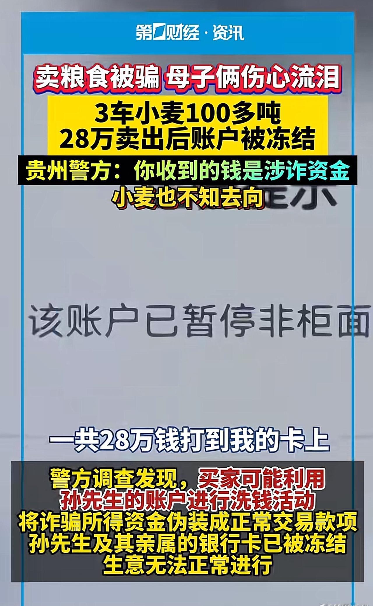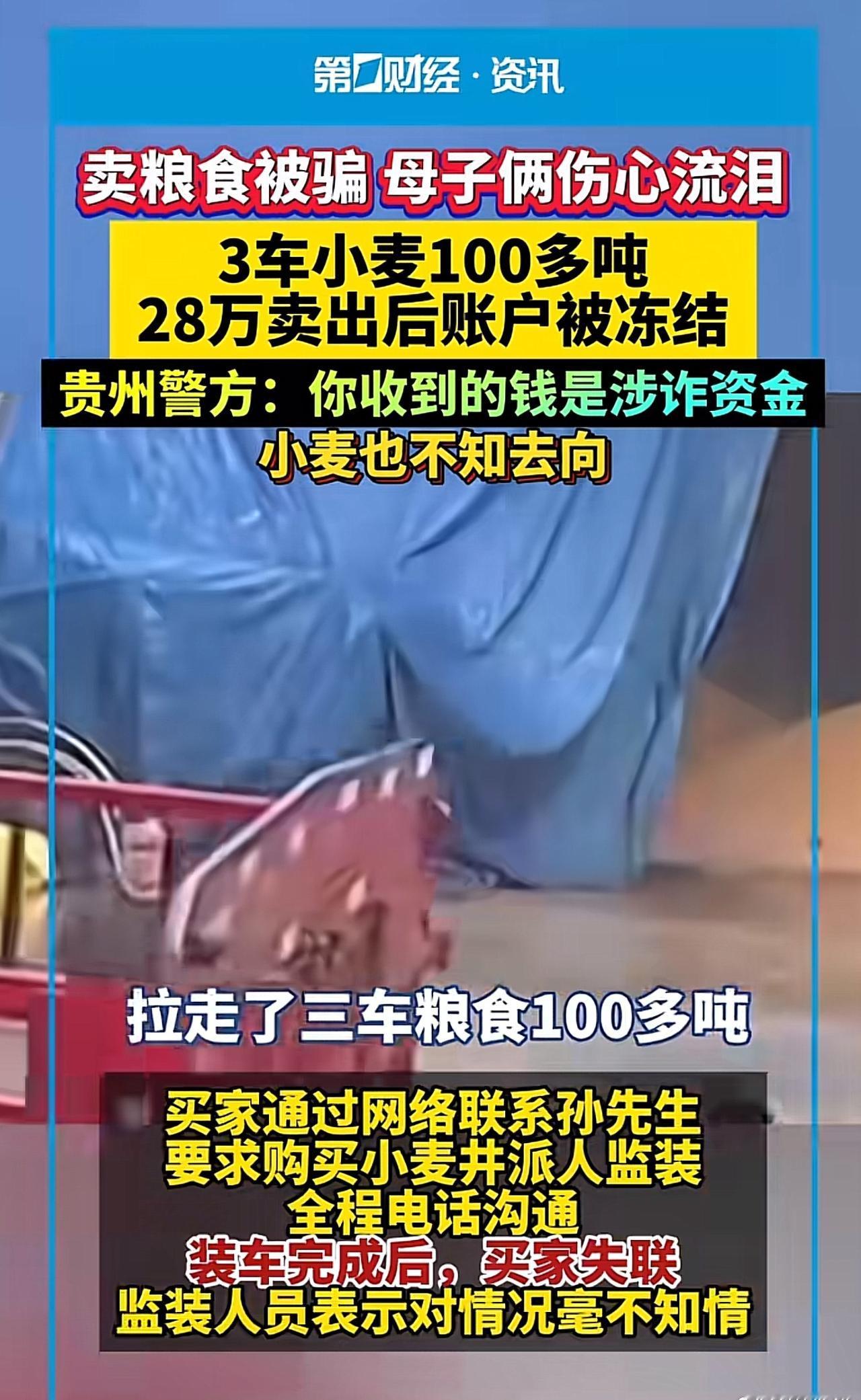 俺卖个粮食都有骗子来骗俺嘞!卖粮款28万秒冻结!贵州母子3车小麦被骗,得知真相当场崩溃!网友纷纷鸣不平! 河南新乡,一对母子通过网络结识一名目秘收粮老板的买家,3车共100多吨小麦以28万元卖出,可钱刚到账,没想到就遭遇晴天霹雳,账户就被警方冻结,小麦也早已不知去向。 母子俩本以为顺利完成交易,正盘算着用这笔钱周转,突遭冻结的消息让他们瞬间慌了神。焦急询问警方后才知,收到的28万元竟是涉诈资金,因上游案件被依法冻结。 想到辛辛苦苦种出的小麦血本无归,母亲不知该如何追回损失,当场崩溃大喊:“俺卖个粮食都有骗子来骗俺嘞!” 此视频曝光后,网友纷纷鸣不平!有网友说:“不应该冻结实际卖货人的资金,人家的买卖是合法,被诈骗者的损失从诈骗份子买的货物上着手,而不是拿守法的卖货开刀。” 也有网友说:“银行早不冻结晚不冻结,等付出去了就冻结,如果核实确实是涉诈资金,那警方有找回小麦的义务,老百姓没有鉴定涉诈资金的能力,不能让无辜百姓承担无妄之灾。” 还有网友则坦言:“太心疼了!农民种地多不容易,血汗钱就这样被牵连,希望警方能尽快帮他们追回损失。” 这起事件周少不得不说戳中了农民群体的痛点,辛勤劳作的成果因涉诈资金牵连而付诸东流。农民缺乏资金风险甄别能力,成为诈骗链条中无辜的“受害者”。 警方冻结涉诈资金合法合规,但更要尽快厘清母子俩的“善意接收”事实,帮其追回合法卖粮款,不能让母子白白受冤屈。 当然,周少觉得这事也给大家提醒。大额交易时,务必通过正规渠道进行,提前确认对方资质与资金合法性,避免卷入此类纠纷。 最后,愿这对母子能早日拿回血汗钱,也盼相关部门能为弱势群体筑牢权益防护网。 对于卖粮款28万秒冻结,大家怎么看这事呢?