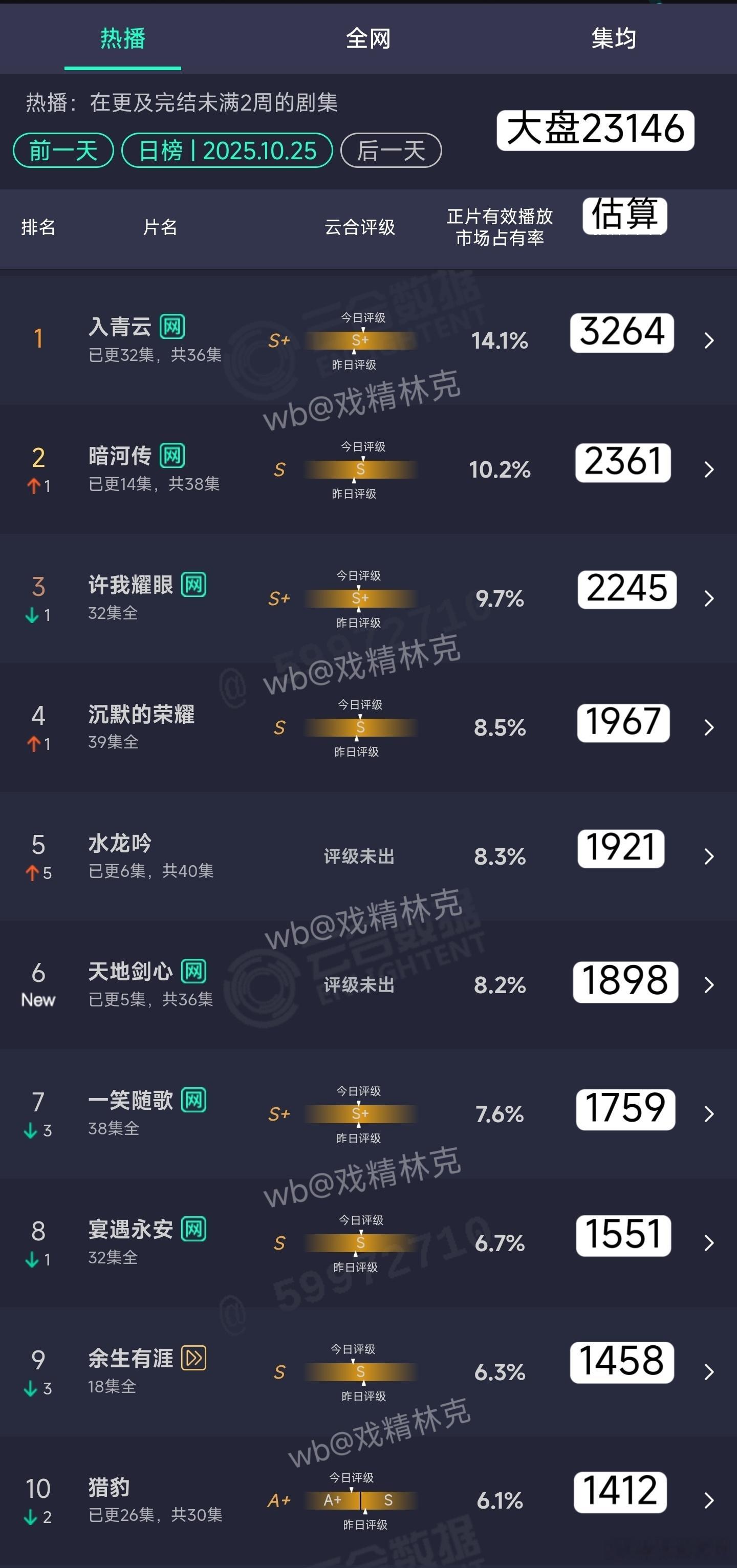 10.25云合估算:暗河传2361万。水龙吟次日1921万。天地剑心首日1898