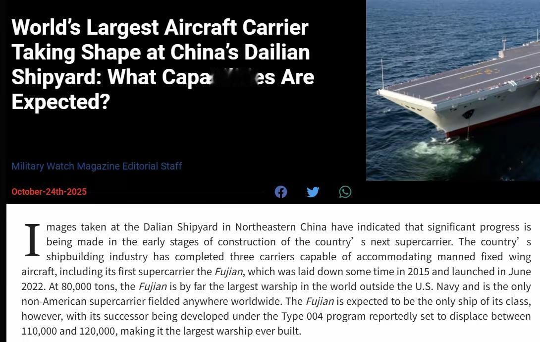 11万吨!美媒宣称:全球最大航母于中国渐具雏形,搭载六代机便能称霸太平洋?还将实现批量生产。这一论调契合美国一贯的“威胁论”炒作作风。 据悉,中国第四艘航母或为核动力,配备电磁弹射装置,甚至可能装备电磁炮,且搭载六代机。这并非毫无可能,毕竟六代机已进行过多次试飞。 中方早已明确表态,永远不称霸,发展军事力量仅仅是出于防御目的。 唯有内心阴暗之人,才见不得他人发展、超越自己。 对此,你作何看法?