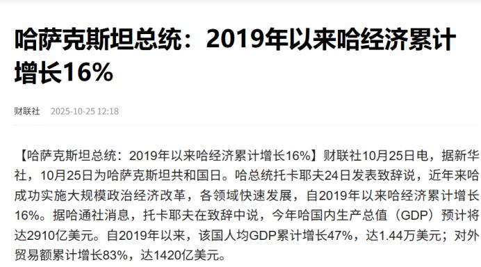 哈萨克斯坦宣布了 2025年10月25日,哈萨克斯坦总统托卡耶夫宣布了一个让人振奋的消息,他说自从2019年以来,哈萨克斯坦的经济总共增长了16%,这真是个了不起的成绩。   要知道哈萨克斯坦能取得这样的成绩,靠的可不是单一的经济模式。长期以来,哈萨克斯坦的经济严重依赖石油出口,这种单一的经济结构在国际市场波动面前显得十分脆弱。但近年来,哈萨克斯坦政府开始大力推动经济多元化发展。   在制造业方面,哈萨克斯坦本土制造业快速发展,民族品牌不断增多。比如,哈萨克斯坦境内的一家工厂目前可生产多个中国品牌汽车,年产量最高达9万辆;还有一家韩国起亚集团的工厂,预计年产能将达7万辆。制造业的发展,让哈萨克斯坦不再仅仅是一个能源出口国,而是在向工业制造领域迈进。   同时哈萨克斯坦也在积极发展旅游业,2024年前8个月,哈萨克斯坦旅游业固定投资额达5276亿坚戈,同比增长69%。计划至本年底实施148个投资项目,创造约2500个就业岗位。   2024年,哈萨克斯坦接待外国游客人数超过1150万人次,住宿设施收入增长27%,外国游客在哈萨克斯坦消费达41亿坚戈,同比增长13.4%。旅游业的兴起,不仅为经济增长注入了新动力,还创造了大量就业机会。   除此之外哈萨克斯坦的经济增长也离不开与中国的紧密合作,中国已取代俄罗斯成为哈萨克斯坦最大的贸易伙伴国。在物流领域,中哈合作成果显著。哈萨克斯坦境内五条国际铁路走廊贯穿而过,2024年过镜运输量将达3300万吨。多斯特克枢纽站作为中哈边境的重要物流节点,换装量规模大幅超越2023年,并且已投用先进的自动化管理系统和人工智能应用,可将作业指令直接下发至集装箱装卸设备,在场站内精准定位箱位并执行作业。   当然数字化转型也是哈萨克斯坦经济增长的重要驱动力,自2021年启动大规模数字化改革以来,哈萨克斯坦政府在多个领域推行数字化方案,服务效率和透明度明显提升。目前,该国92%的政务服务已可在线办理,覆盖医疗、教育、交通等重点领域。   在信息技术产业方面,哈萨克斯坦IT企业数量已超过1.8万家,阿斯塔纳国际科技园汇聚千余家创新企业,成为推动行业发展的重要平台。哈萨克斯坦还在积极发展人工智能技术,已出台一系列发展规划,并着手制定人工智能相关法律。中亚首个人工智能国际中心正在该国筹建,哈萨克语大语言模型已向科研和产业界开放。今年7月,该国首台超级计算机正式投入使用,为高校科研和企业发展提供算力支持。   通信基础设施建设也在稳步推进。截至目前,哈萨克斯坦互联网普及率已达93%,移动通信覆盖率达98%。光纤网络十年间增长12倍,5G网络正在主要城市铺开。数字化的发展,不仅提高了政府的管理效率,也为企业的创新和发展提供了良好的环境。   然而哈萨克斯坦的经济发展也面临着一些挑战。比如通货膨胀问题仍然存在。2025年5月,哈萨克斯坦居民消费价格指数(CPI)同比上涨11.3%,主要受服务价格上涨推动,食品价格涨幅亦有所扩大,5月CPI环比上涨0.9%,高于往年同期水平。核心通胀指标显示,消费需求旺盛、企业成本上升以及财政支出扩大,持续对物价水平构成上行压力。   此外哈萨克斯坦的经济增长还面临着一些外部风险。世界银行2024年2月发布的哈萨克斯坦经济报告显示,该国经济增长前景因一些内部和外部因素面临下行风险,包括哈萨克斯坦通过里海管道的石油出口可能因俄乌冲突延宕、加剧而中断、多重外部压力和本币哈萨克斯坦坚戈的汇率波动正导致通货膨胀加剧、与俄罗斯的经济联系引发次生制裁的风险仍然存在等。   但总体来看,哈萨克斯坦的经济发展势头良好。总统托卡耶夫表示,哈萨克斯坦将继续加快经济多元化和现代化,致力于“成为欧亚大陆主要物流中心和交通枢纽”。随着一系列改革措施的推进和与国际社会合作的不断深化,哈萨克斯坦有望在未来实现更可持续的经济增长。   来源:财联社  【哈萨克斯坦总统:2019年以来哈经济累计增长16%】
