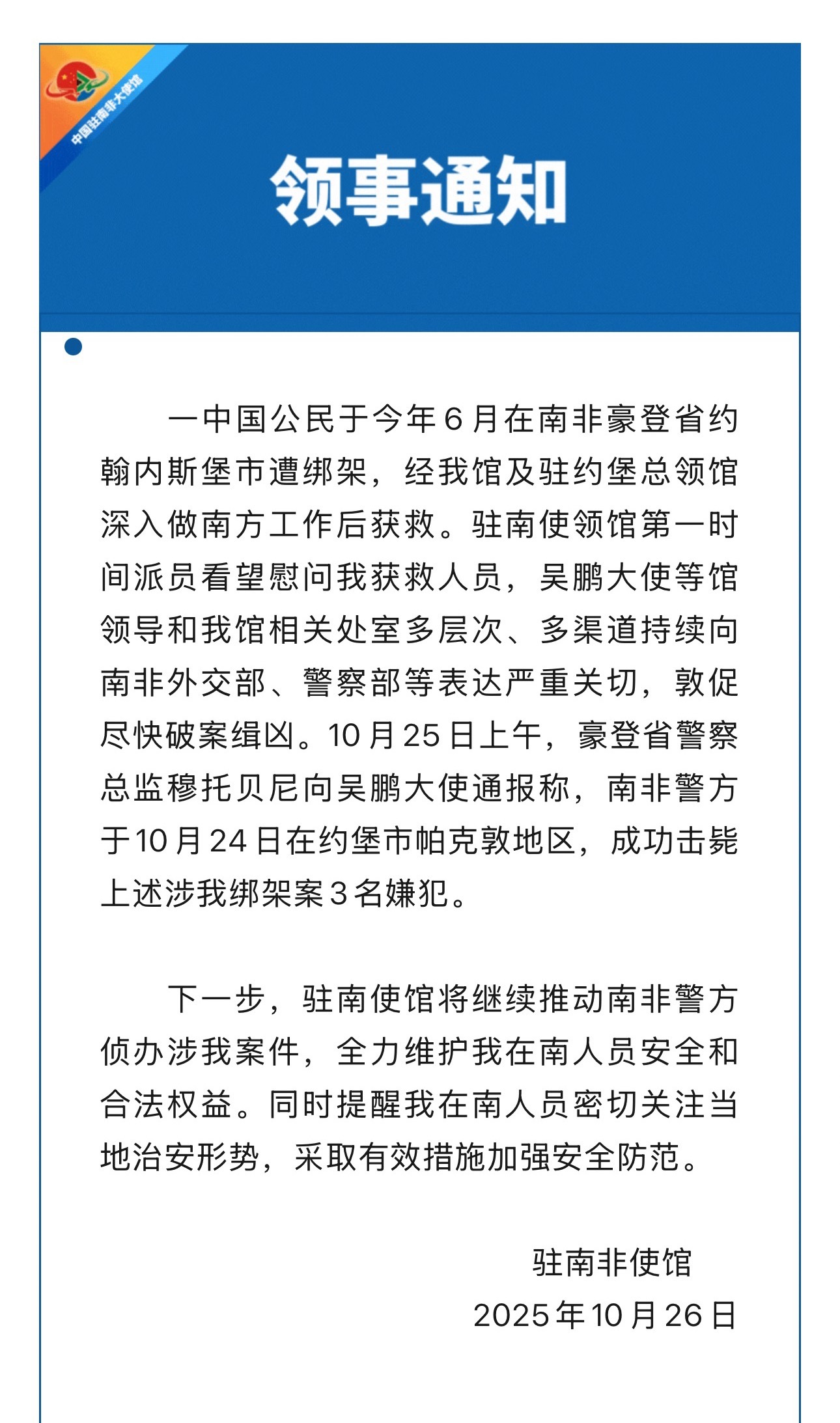 #南非警方击毙绑架中国公民3名嫌犯#【中国驻南非使馆赞赏南警方击毙涉我绑架案嫌犯】驻南非使馆:一中国公民于今年6月在南非豪登省约翰内斯堡市遭绑架,经我馆及驻约堡总领馆深入做南方工作后获救。驻南使领馆第一时间派员看望慰问我获救人员,吴鹏大使等馆领导和我馆相关处室多层次、多渠道持续向南非外交部、警察部等表达严重关切,敦促尽快破案缉凶。10月25日上午,豪登省警察总监穆托贝尼向吴鹏大使通报称,南非警方于10月24日在约堡市帕克敦地区,成功击毙上述涉我绑架案3名嫌犯。