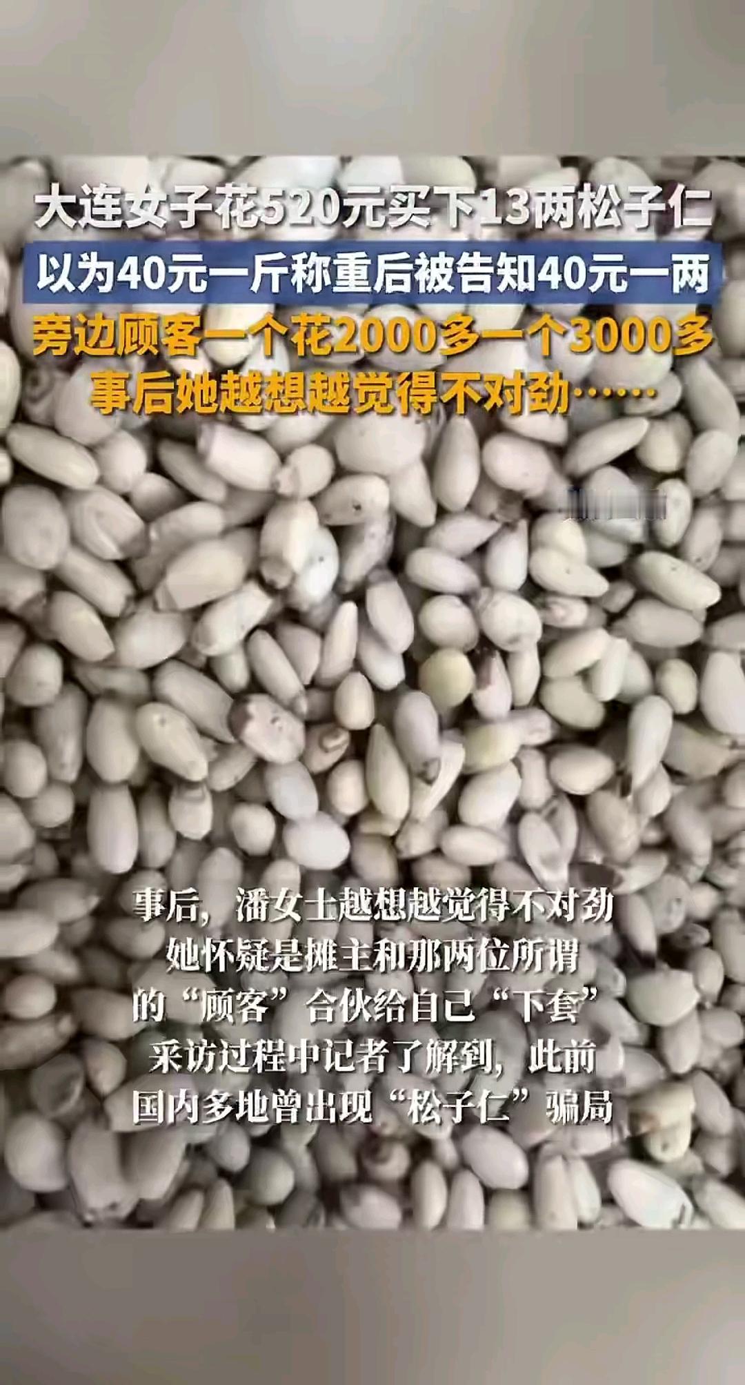 大连一女子花费520元购买松子仁 事后越想越觉得这事不对劲。 听着40块的价码觉得划算 以为是斤 结账才知是两 13两松子仁要掏520 这价格比吃肉还贵 旁边俩“顾客”演得真像 一个花两千多 一个掏三千多 当时只觉得人家阔气 事后才反应过来是托儿 这套路跟早年切糕骗局一个路数 先报低价勾你上钩 等称好东西再翻脸涨价 旁边还有托儿烘托气氛 摊主算准了人爱凑热闹 看别人买就跟着心动 没细问单位就下手 正好掉进预设的坑 不是松子仁金贵 是骗子的套路精 专挑大意的人下手 把“愿者上钩”玩成生意 现在路边摊的便宜要慎占 张口报价先问清单位 不然看似划算的买卖 实则是肉包子打狗 到底是骗子手段太高明 还是我们太容易贪小便宜 你们说 遇到这种“低价”诱惑 该怎么防着不上当松子休闲零食
