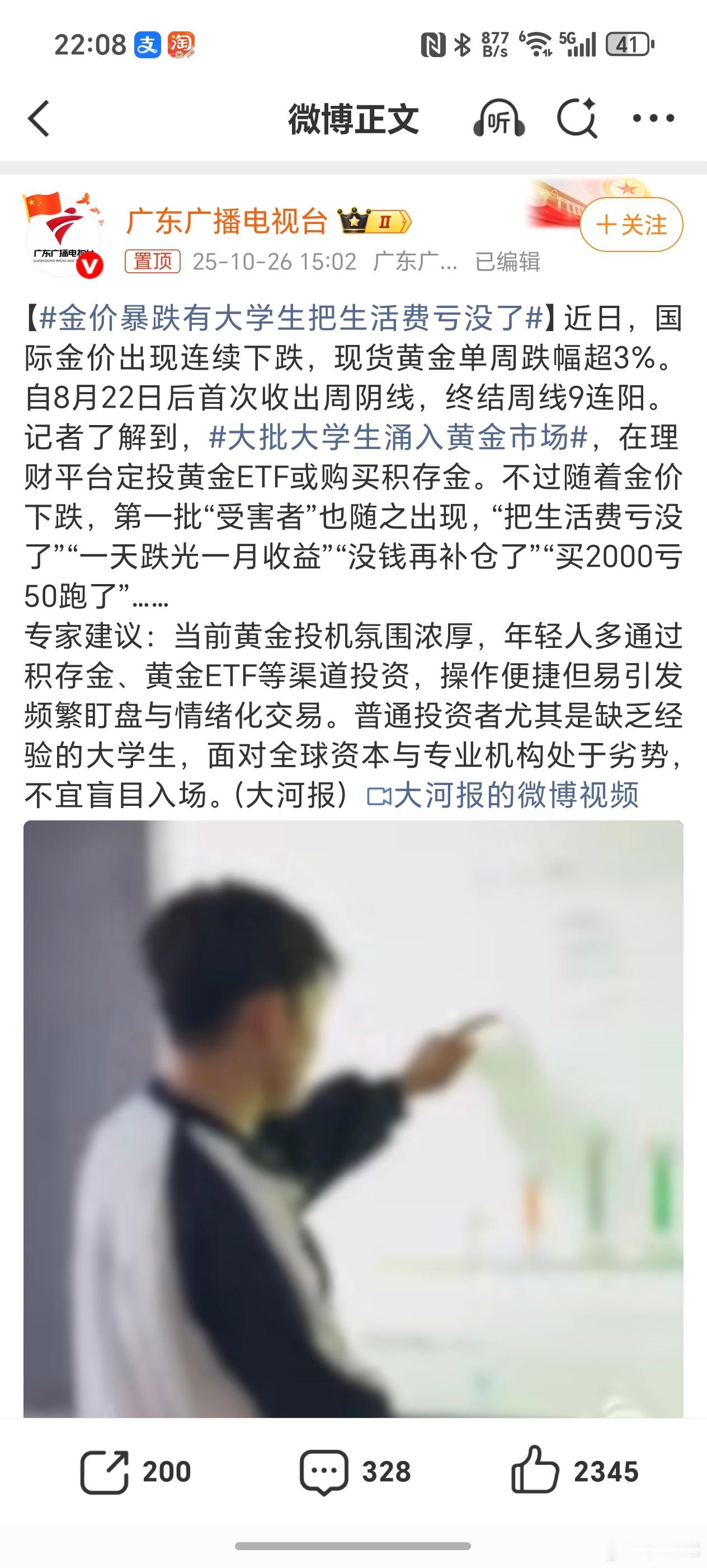 金价暴跌有大学生把生活费亏没了想不到月收入几乎为零的大学生也开始理财了[允悲]