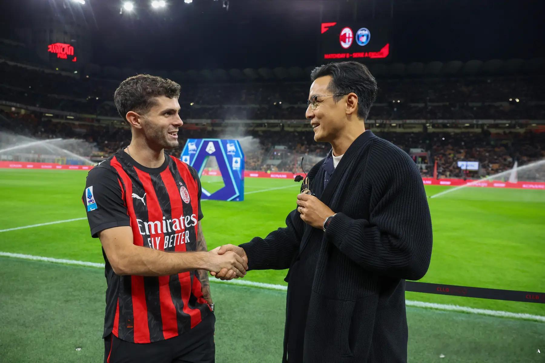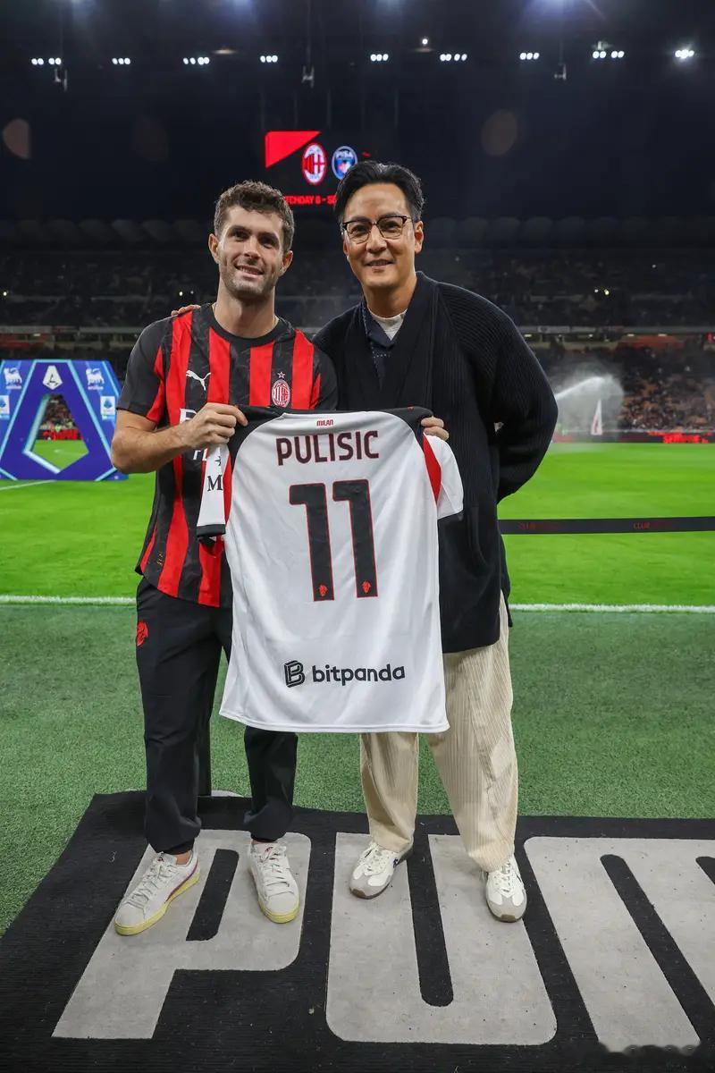当地时间2025年10月24日,意大利米兰,25/26意甲第8轮,AC米兰Vs比萨,吴彦祖观看意甲比赛,获赠普利西奇签名球衣。