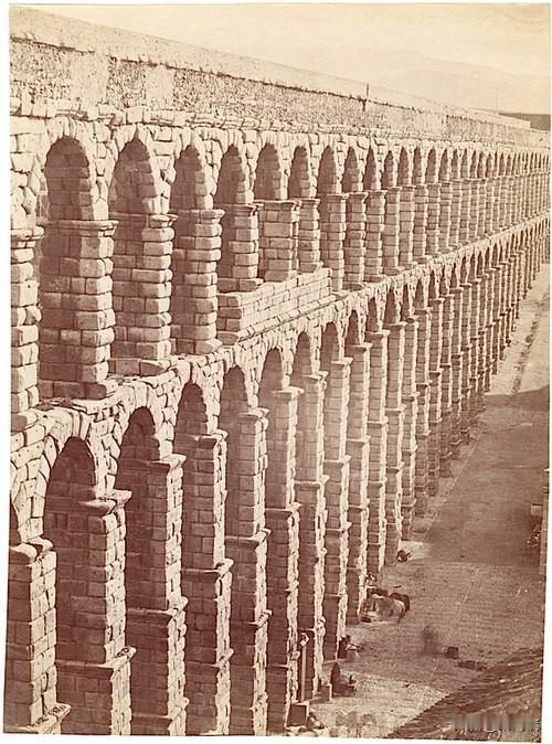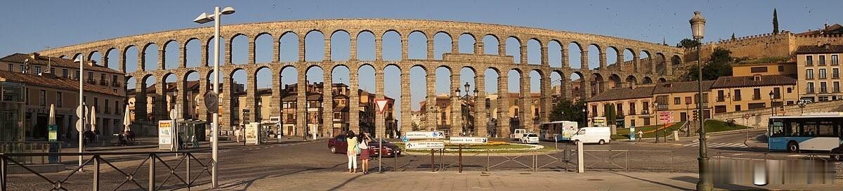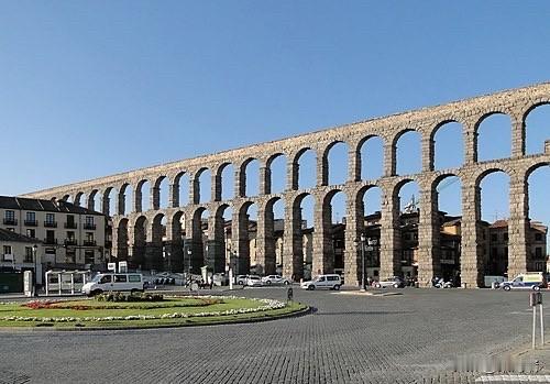 罗马皇帝图拉真(公元98-117年)在西班牙塞哥维亚建造的巨大的罗马渡槽,也称塞哥维亚渡槽。 塞哥维亚渡槽(西班牙语: Acueducto de Segovia)是西班牙的一座古罗马渡槽,建于公元一世纪左右,将山间泉水引到17公里(11英里)外的塞哥维亚喷泉、公共浴场和私人住宅,一直使用到1973年。其高架部分及其由167个拱门组成的完整拱廊是保存最完好的古罗马渡槽桥之一,也是塞哥维亚最重要的象征,其出现在城徽上便是明证。塞哥维亚老城和渡槽于1985年 被列为联合国教科文组织世界遗产。 这条渡槽曾经将水从位于拉阿塞贝达地区山区、距离城市 17 公里(11 英里)的里奥弗里奥河(Rio Frio )输送过来,全长 15 公里(9.3 英里)才抵达城市。 渡槽的建造遵循了维特鲁威在公元前一世纪中叶出版的 《建筑学》中提出的原则。 水首先被收集到一个名为El Caserón(大房子)的水箱中,然后通过一条水渠输送到名为Casa de Aguas(水屋)的第二座塔楼。在那里,水经过自然倾析,使沙子沉淀下来,然后继续流淌。接下来,水以1%的坡度流淌了728米(796码),最终到达了Postigo (波斯蒂戈)的高处。Postigo是一块露出地面的岩石,城墙环绕的市中心及其城堡就坐落在这块岩石上。 要到达老城区,水要通过渡槽桥。在迪亚兹桑斯广场,渡槽桥突然转向阿索格霍广场。从这里开始,这座纪念碑开始展现它的全部辉煌。渡槽最高处达 28.5 米(93 英尺 6 英寸),包括近 6 米(19 英尺 8 英寸)的地基。渡槽由柱子支撑,有单拱和双拱。从渡槽进入城市的地方直到迪亚兹桑斯广场,它包括 75 个单拱和 44 个双拱(单独计算为 88 个拱),其次是 4 个单拱,总共 167 个拱。 渡槽的第一部分包含 36 个半圆形拱门,重建于 15 世纪,以修复1072 年被摩尔人摧毁的部分。拱门分为两层,装饰简单,简单的模具固定框架并为结构提供支撑。上层的拱门宽 5.1 米(16.1 英尺)。拱门分为两层,顶部的柱子比下层的柱子更短更窄。结构的顶部包含水道,水通过一个高 0.55 米、直径 0.46 米的 U 形凹槽流过。每个柱子的顶部横截面积为 1.8 x 2.5 米(5.9 x 8.2 英尺),底部横截面积为 2.4 x 3 米(7.9 x 9.8 英尺)。 这座渡槽由未经砂浆砌筑的砖状花岗岩 块砌成。在罗马时代,三个最高的拱门上各有一个青铜字母的标志,标明建造者的姓名和建造日期。如今,渡槽两侧仍然可见两个壁龛。其中一个壁龛据说供奉着赫拉克勒斯的雕像,传说他是这座城市的缔造者。现在,这个壁龛里供奉着圣母像。另一个壁龛里供奉着圣斯蒂芬的雕像,但现已佚失。