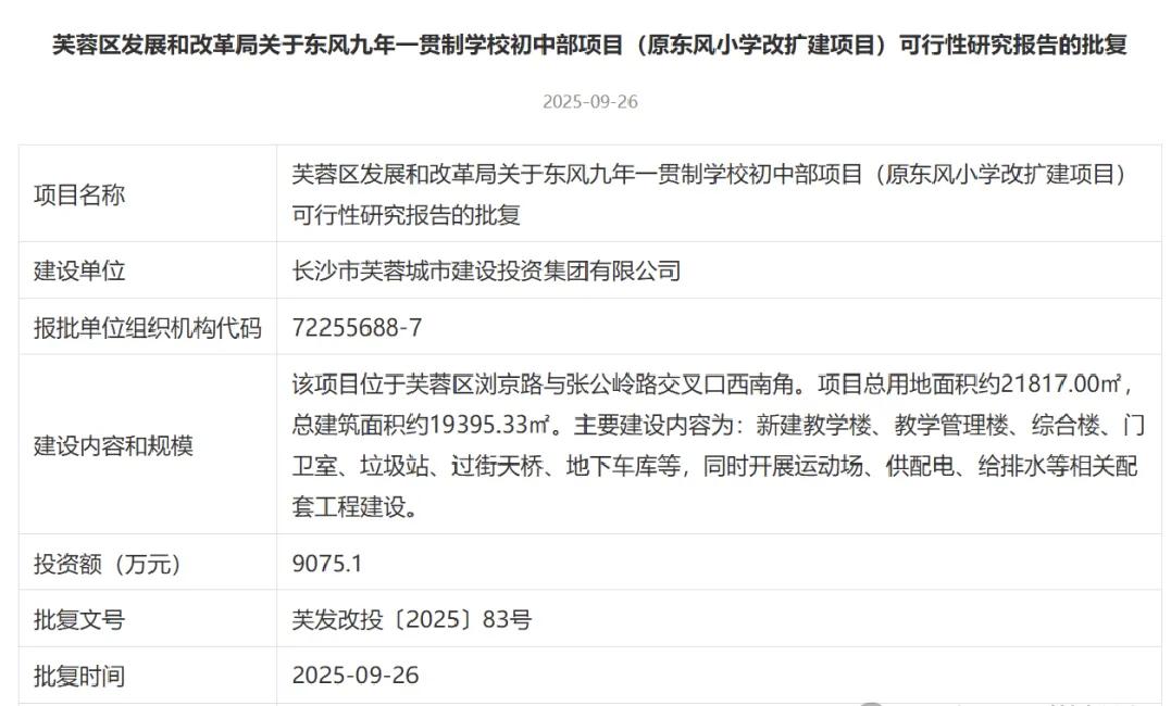 芙蓉区隆平片区教育版图再扩容,长沙市自然资源和规划局最新批前公示显示,东风小学改扩建九年一贯制学校项目已进入招标筹备阶段,计划引入长沙市一中双语品牌并命名为“一中双语实验学校东校区”,这是区域内第二所由小学升级的九年一贯制学校。 该校坐落于芙蓉区隆平片区核心地带,东临张公岭路、北接浏京路,与现有东风小学毗邻,总用地2.18万㎡、建筑面积1.88万㎡,规划初中24个班(每年级6个班),可容纳1200名学生,主要服务远大路城市更新板块。值得关注的是,学校采用“一校两址”模式运营,东校区与本部由同一负责人管理,直线距离仅3.5公里,便于骨干教师轮岗交流,实现管理、师资与教学体系的全面共享。 在2025年长沙中考人数突破6.7万、四大名校老校区录取率下滑的背景下,一中双语本部交出了硬核成绩单:731人参考,四大率攀升至近15%,普高率超70%,28个指标生全部录满,最低分数线659分,稳居公办初中前十。其师资力量同样亮眼,截至2024年底拥有正高级教师2人、特级教师1人,省市区级骨干教师68人,353人次获各级教学竞赛一等奖,且已建成平板全覆盖的智慧校园,实现精准教学。 此次东校区落地的隆平片区,作为长沙“全球研发中心城市”主阵地,聚集了岳麓山实验室、7家上市公司及2490名农业技术专家,高知群体对优质教育需求迫切。项目已于2025年9月取得可行性批复,即将启动实质性建设,建成后将与湘郡培粹隆平校区等形成教育集群,进一步完善“全球隆平芯谷”的配套能级 。目前,中交瑞启芙蓉等周边楼盘已明确纳入招生范围,片区内3条地铁(含在建7号线)及湘雅二医院新院区(2027年建成)的规划,更让优质教育与生活配套形成叠加优势。