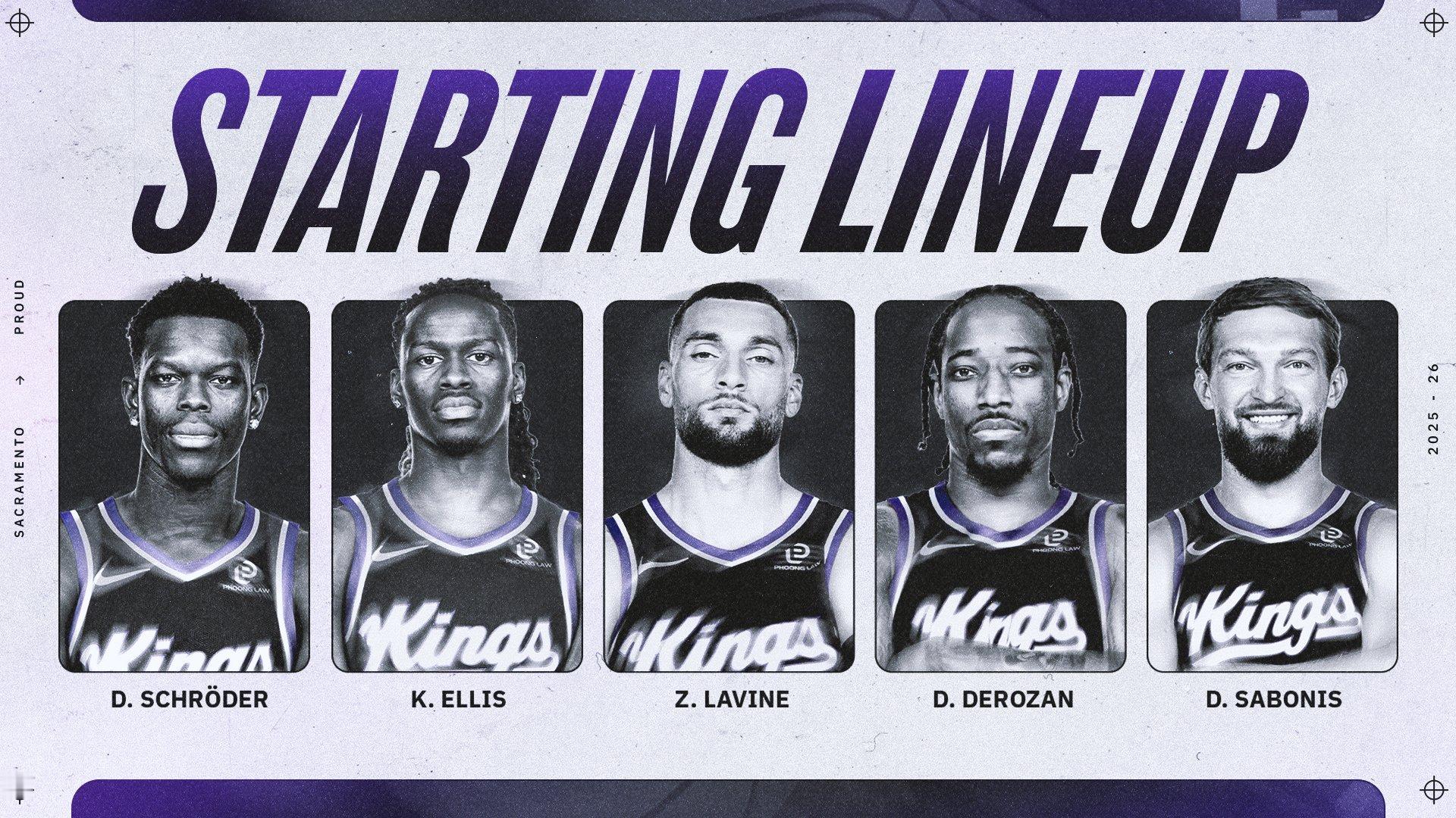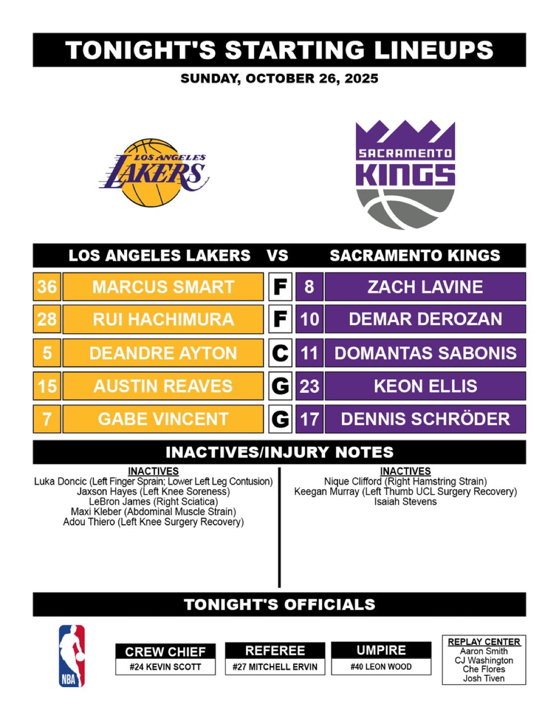 湖人首发:里夫斯、文森特、斯玛特、八村塁、艾顿国王首发:施罗德、拉文、德罗赞、艾