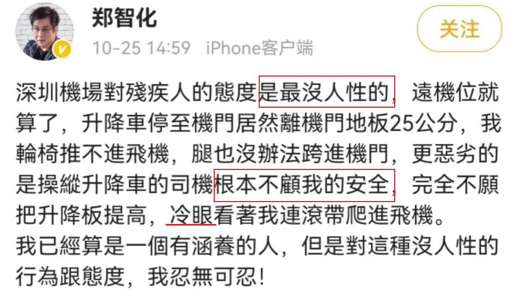 之前看了郑智化批深圳机场帖子,我还真以为他是勿勿忙忙、连滚带爬上的飞机,后来看别人发的现场视频,才发现他有些言过其实,反而觉得深圳机场的致歉有点看人下菜碟——因为郑的明星身份。 残疾人行动本来就不便,那是他自身原因,不可能像正常人一样轻松快捷啊。机场提供的服务并无太多瑕疵,两个工作人员推着轮椅送到机舱口,一直扶他上了飞机,这服务对于普通人来说很到位了吧。明星到哪里都被“娇宠”惯了,自视高人一等,稍有不到的立马发威,深圳机场之所以道歉,说到底还是害怕明星效应…… 机场人员对他的照顾,他是一句也没提,就盯着不如他意的地方喋喋不休,不能让残疾人瞎说,pua健全人吧?!他残疾就是王?!他对工作人员的帮助毫无感谢,倒打一耙! 他关心的不是残疾的身份;他关心的是他这么大一个明星,你们怎么没有认出来,怎么没有优待,怎么没有围观? 大家对此事有何看法?