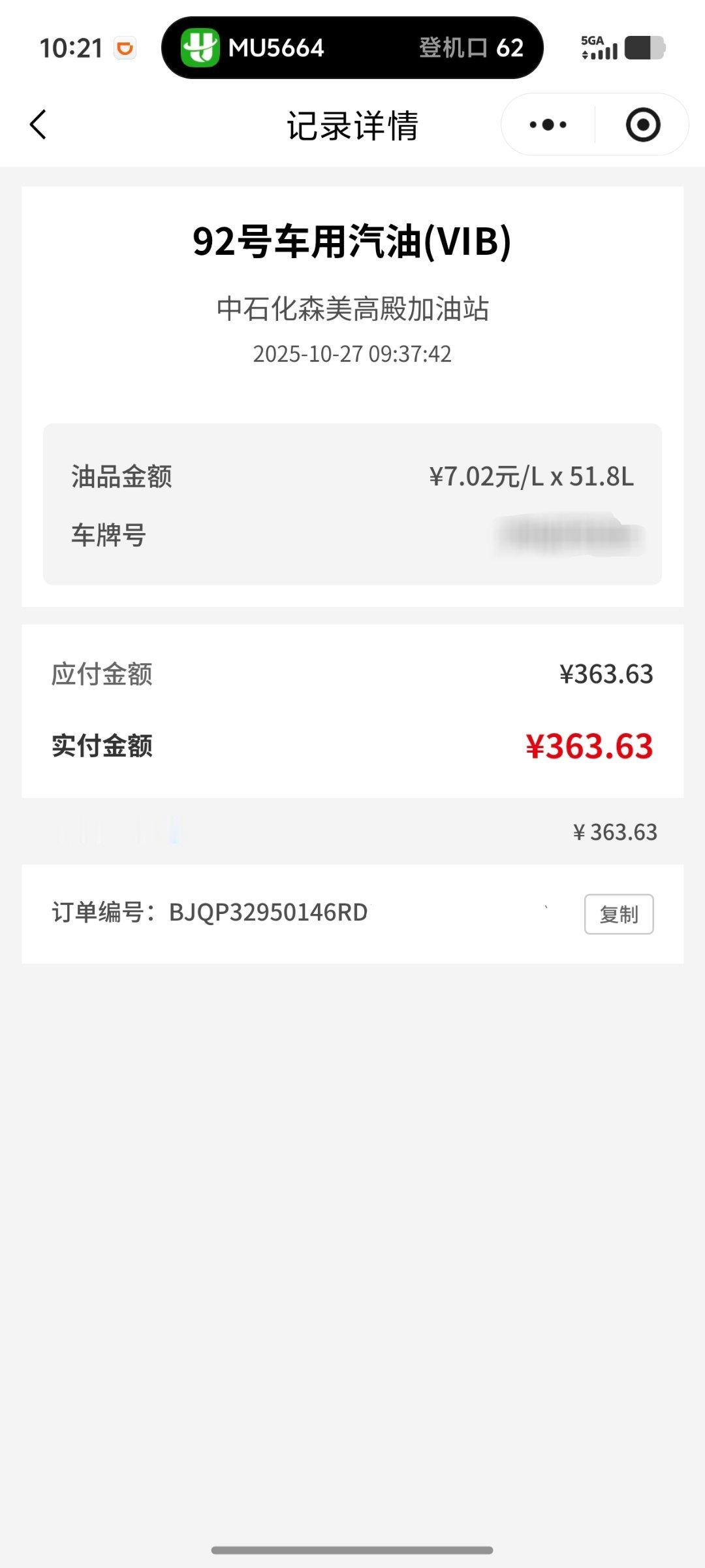 加油加了 51.8 L,363.63 元,平均油耗 6.23 L/100 km,约合 0.438 元/km。