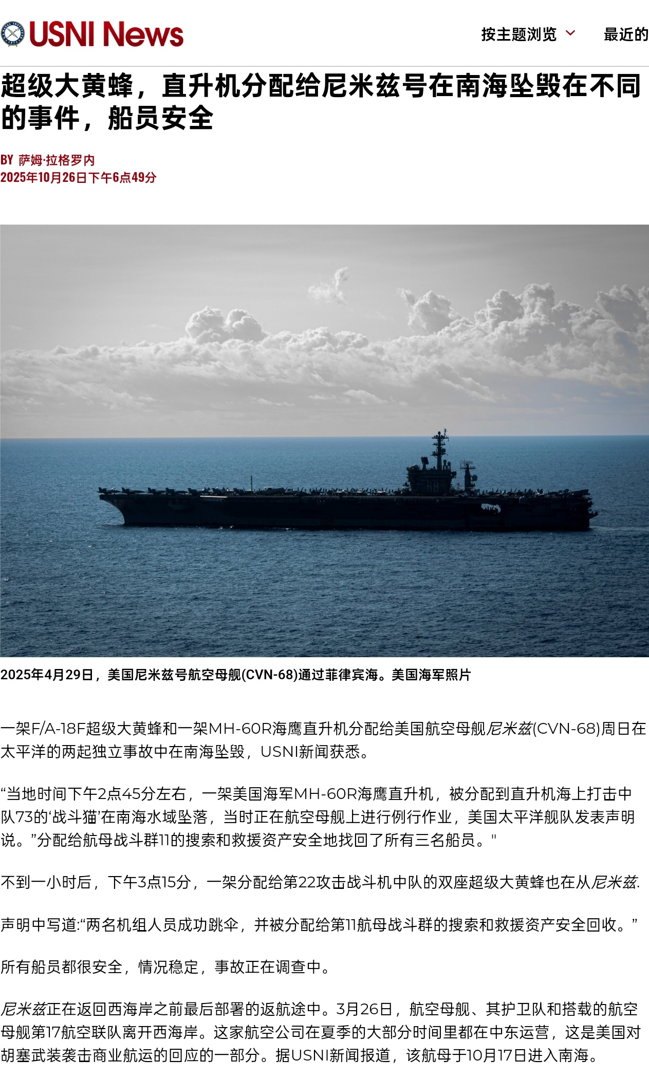 2025年10月26日下午,美国海军“尼米兹”号航母(CVN-68)在南海执行任务期间,半小时内连续发生两起坠机事故: