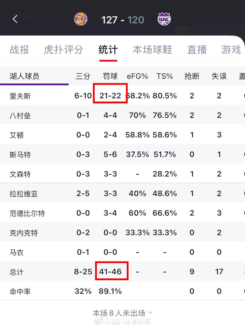 全队罚46球,哨兵里夫斯一人罚22球,比国王12个人加起来还多4次。