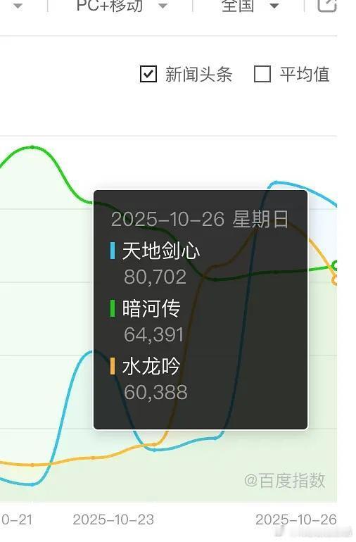 暗河传、水龙吟和天地剑心开播前后三天百指,水龙吟和暗河传都是一直涨,只有天地开播次日就降了百指。