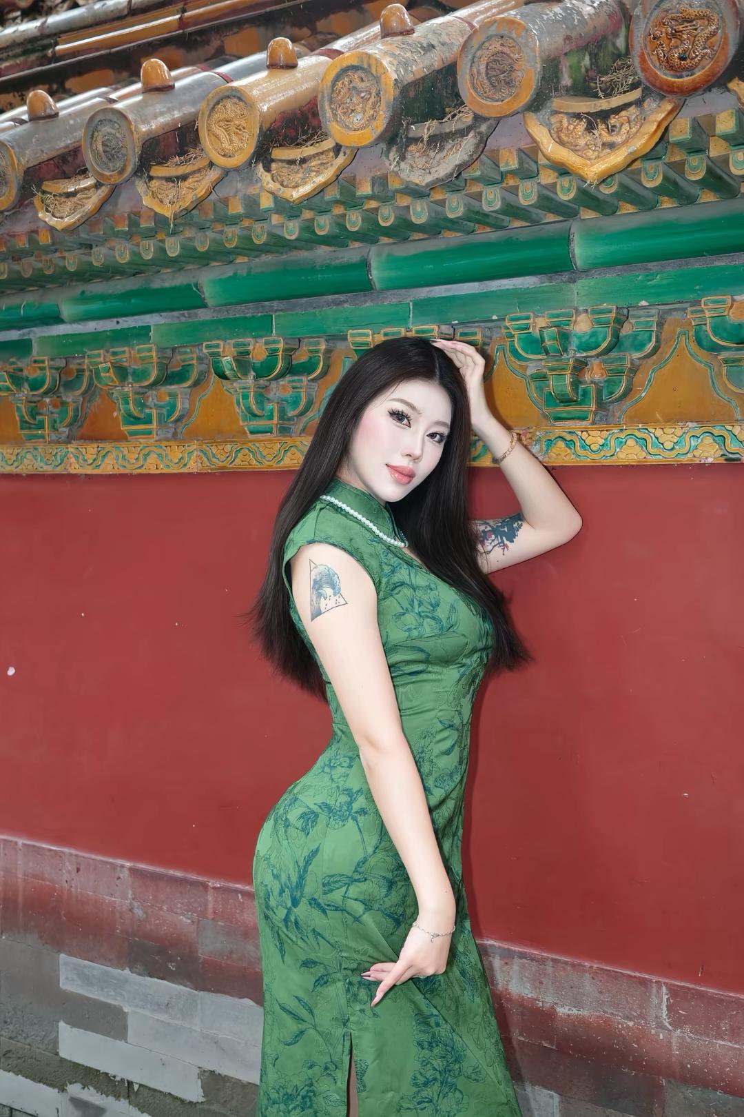 绿衣美人倚栏杆,古塔倒影入画来。高清美女