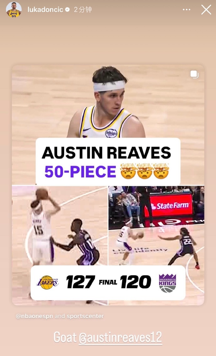 【#东契奇说里夫斯是Goat# 】NBA常规赛,国王主场迎战湖人。本场比赛,湖人队的东契奇和海斯也伤缺,里夫斯砍下生涯新高的51分,带领球队以127比120战胜国王。赛后,东契奇更新社媒,直呼里夫斯“GOAT”。