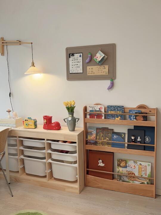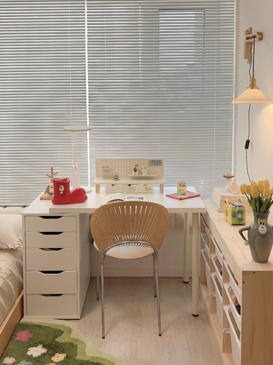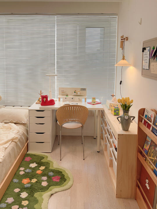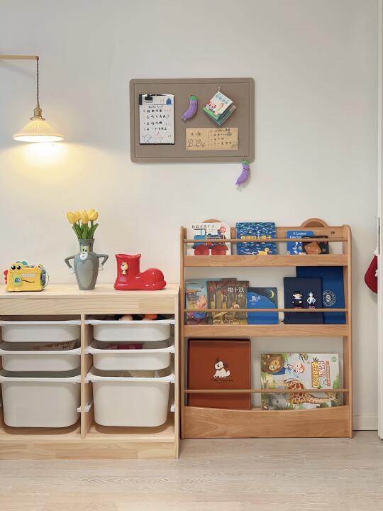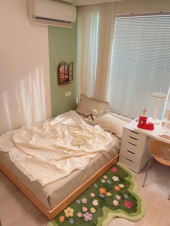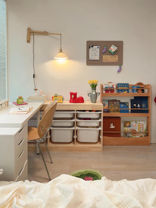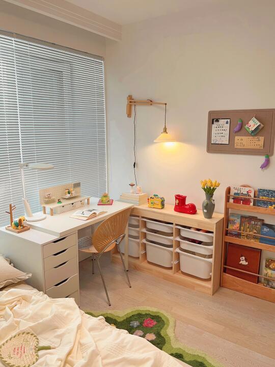 感觉儿童房还是床靠墙更有安全感,空间大而且宝宝也安全,这样搭配真的又实用又温馨