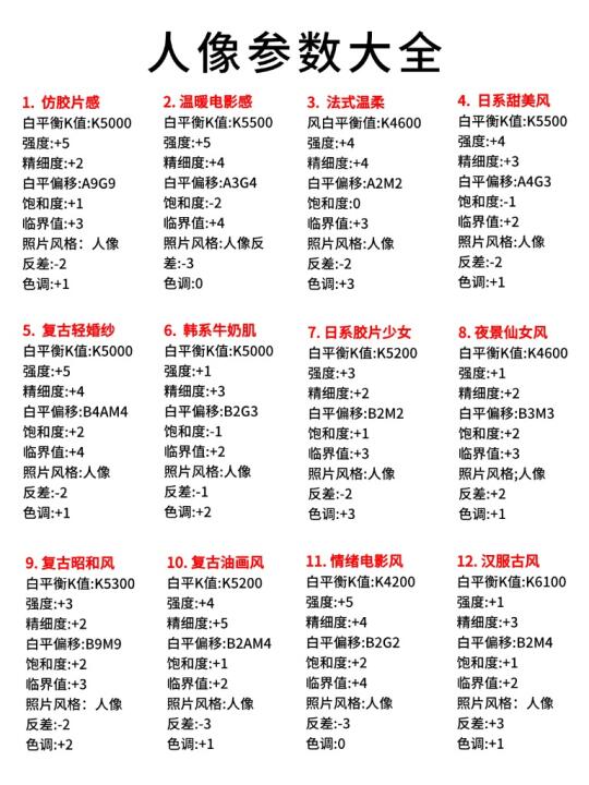 学摄影先了解怎么调节各个参数设置,这样你就能拍摄各种风格的人像照片了!! 今天给大家整理了用过的12种相机参数摄影,你看完也能原图直出啦~ 记得用上补光道具会更出片哟!!