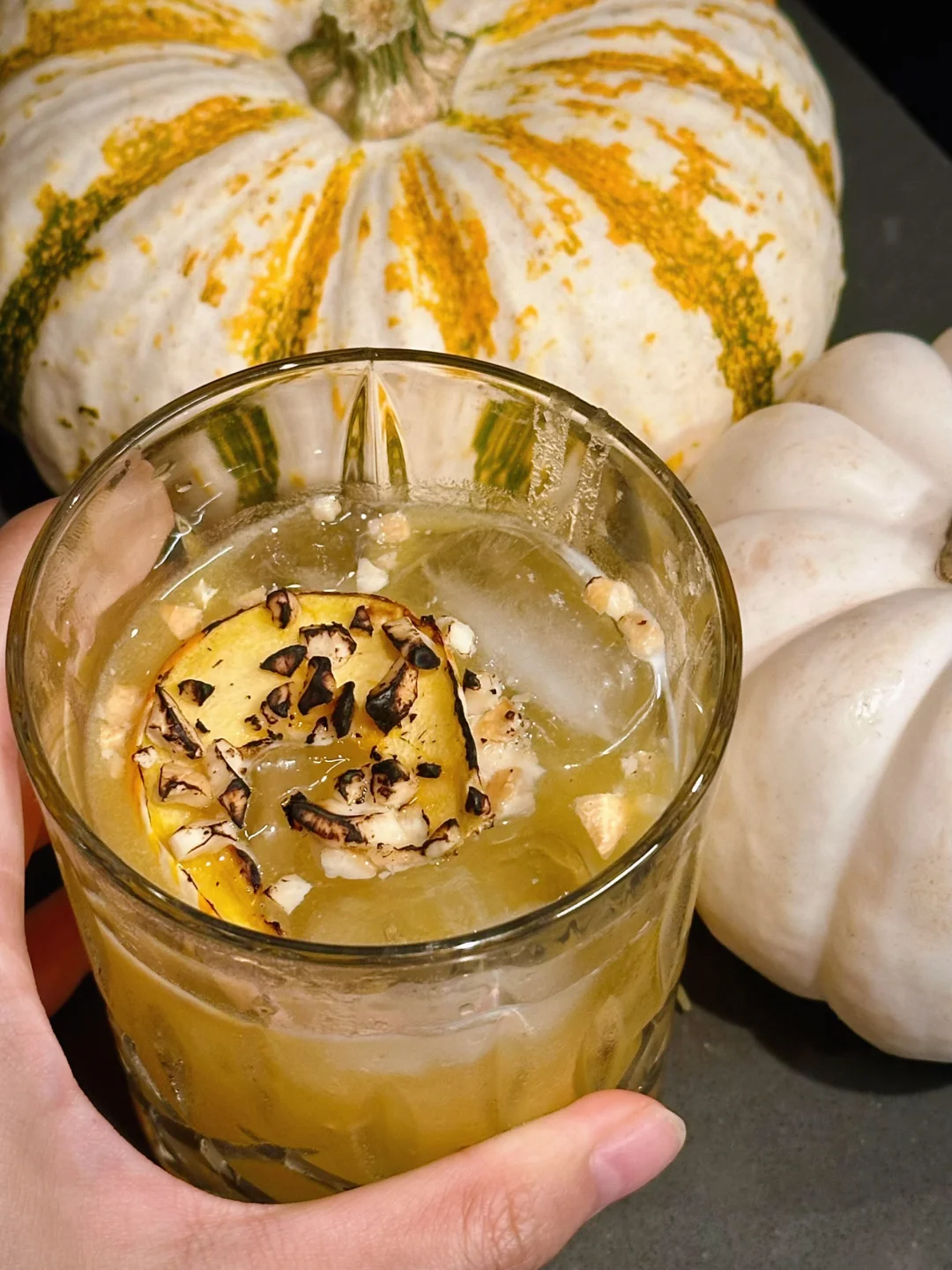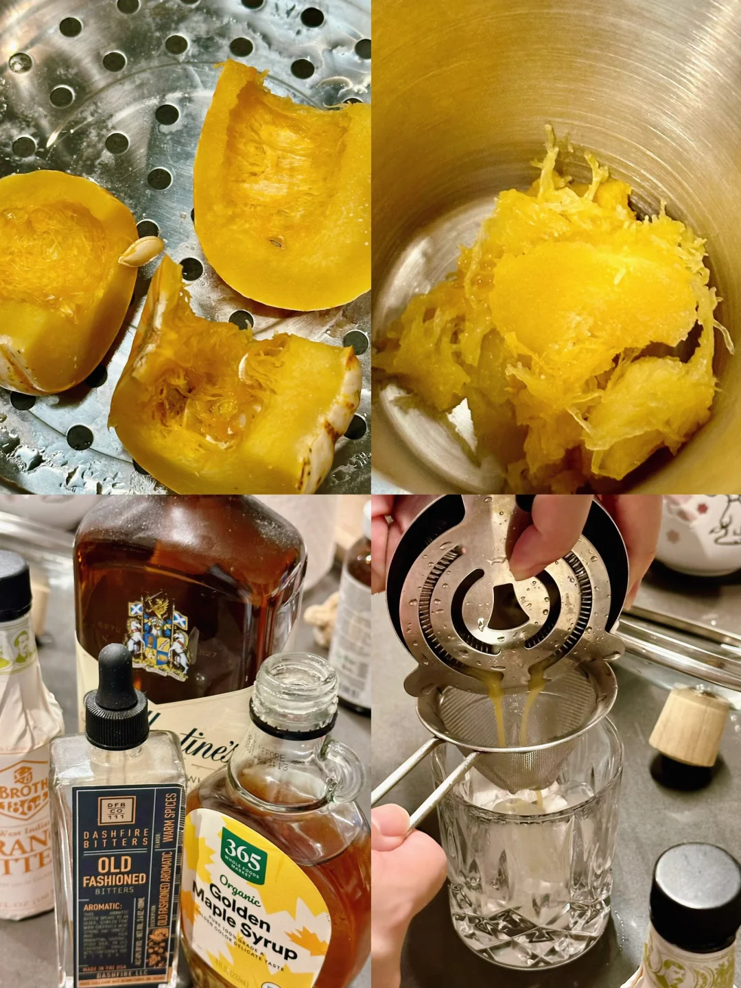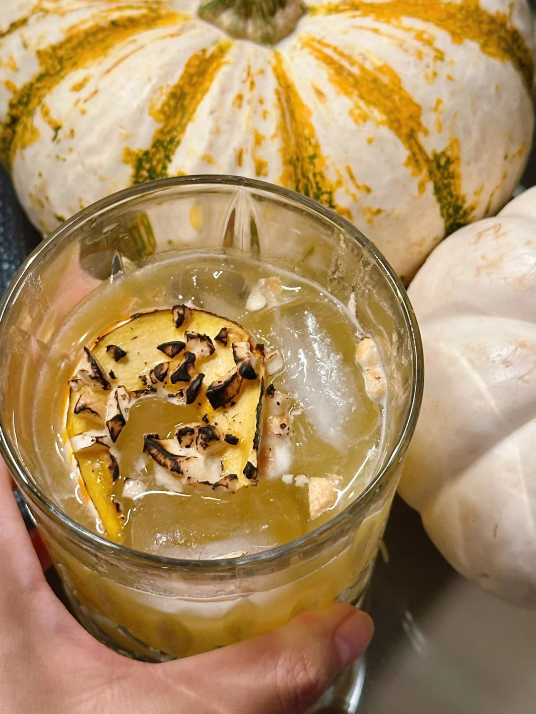 南瓜(建议选柔软清甜水分多的,如honeynut,或者图里这种迷你南瓜),威士忌,枫糖浆,苦精,冰块,腰果碎。