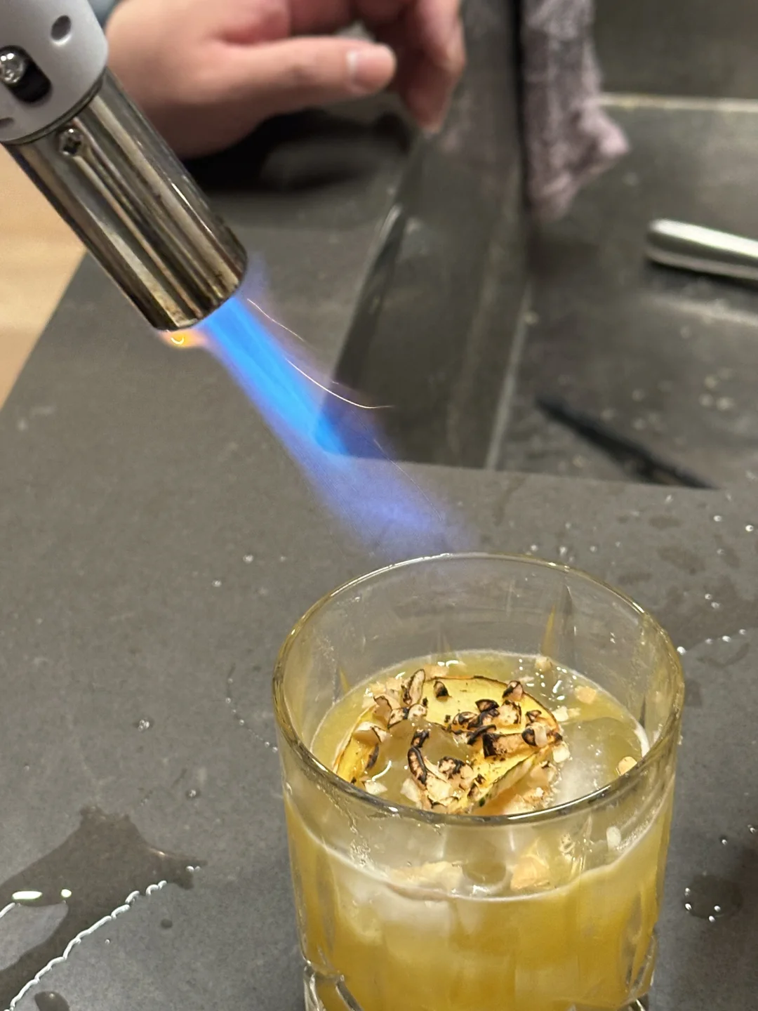 没想到是用新鲜南瓜泥搭配威士忌和枫糖浆,还有烤脆的南瓜片和腰果碎!南瓜泥清甜,让烈酒入口也顺滑柔和了好多。顶上南瓜片和腰果碎被喷枪烤得甚至有点碳火香,配合枫糖浆的甜香,不需要再加很多东西,就自然是秋冬的安逸感。