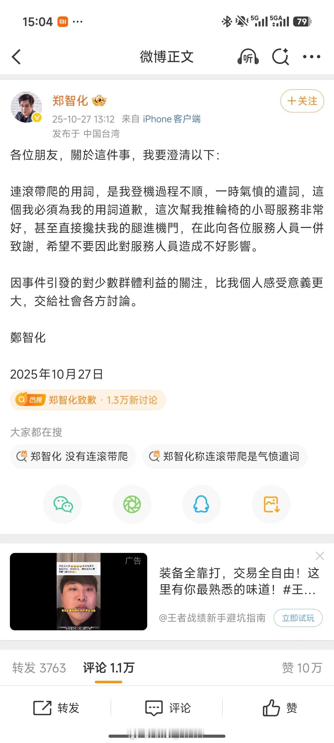 郑智化致歉郑智化回应:没有连滚带爬……[流鼻血]